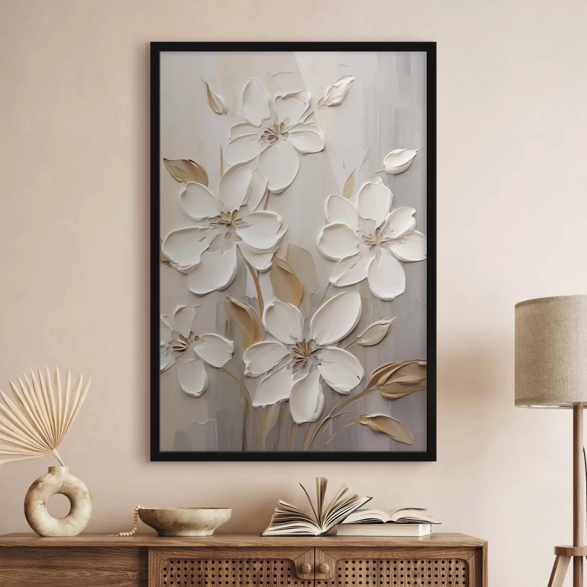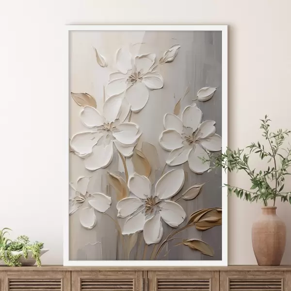 Poster Abstraktsed valged lilled tekstuuriga kroonlehtedega neutraalsel taustal, millel on peenikesed pintslitõmbed. Nr f47874