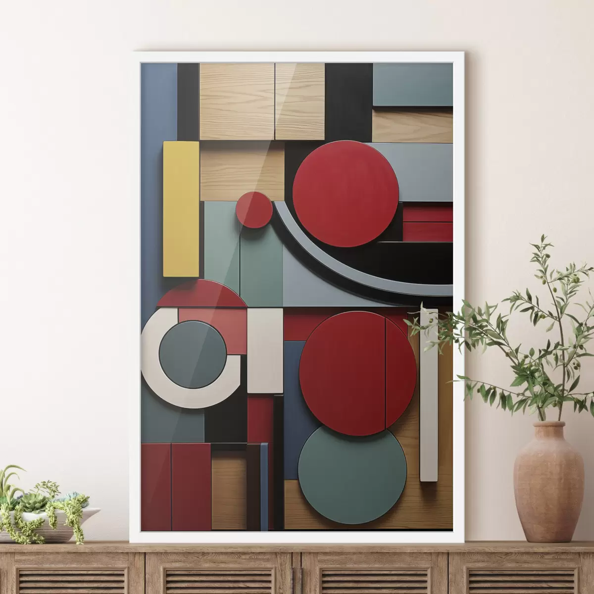 Plakat Abstraktne geomeetriline kompositsioon puidu tekstuuri imitatsiooniga, punased, mustad, valged ja sinakasrohelised ristkülikud ja ringid f47876