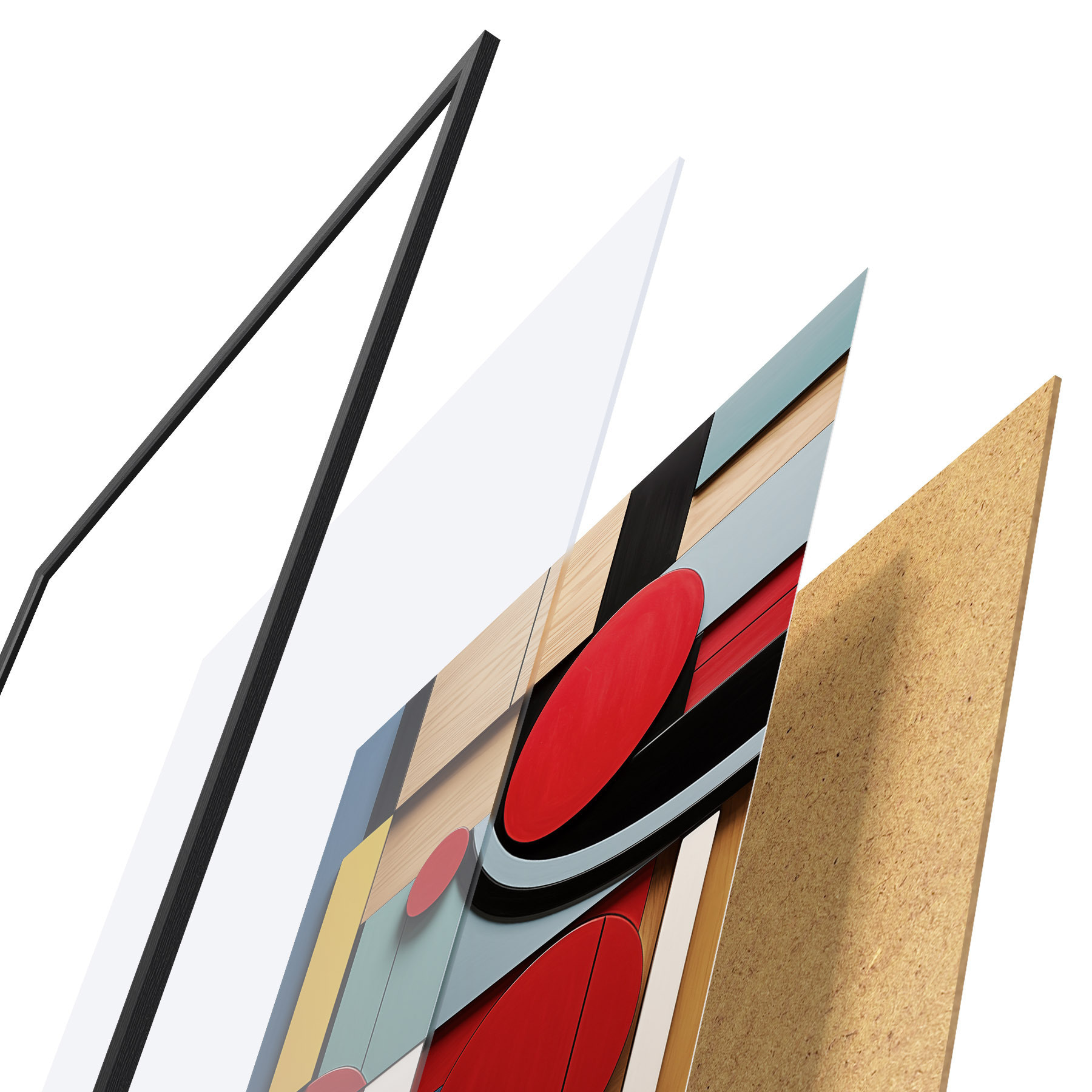 Poster Abstraktne geomeetriline kompositsioon puidu tekstuuri imitatsiooniga, punased, mustad, valged ja sinakasrohelised ristkülikud ja ringid Nr f47876