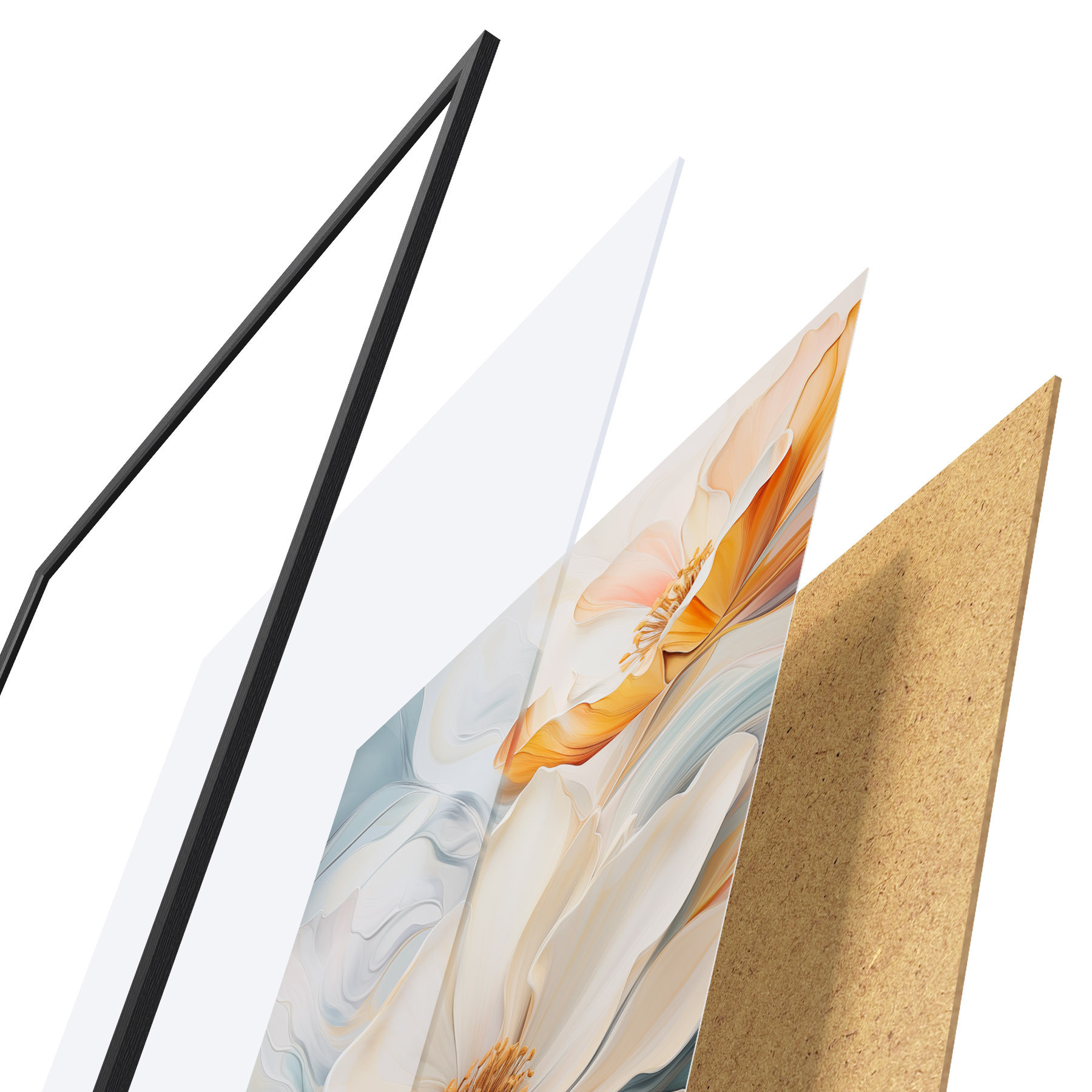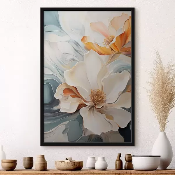 Plakat Abstraktne suur õis valge, oranži ja sinakasrohelise kroonlehtedega, tekstuuriga taustaga f47878