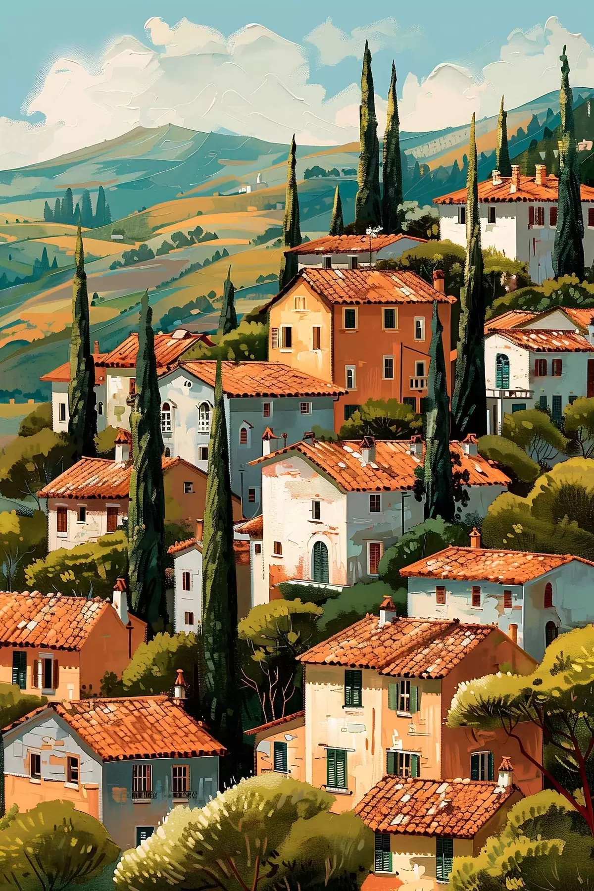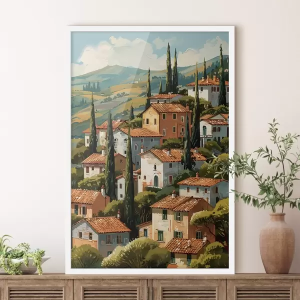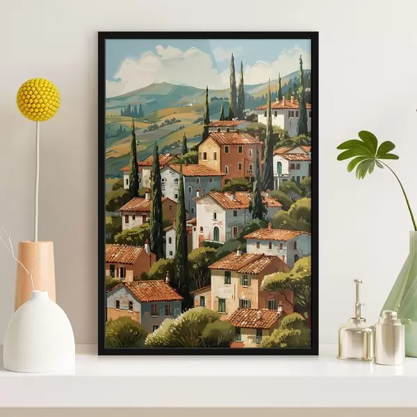 Plakat Vahemere mäenõlvadel asuv küla, soojatoonilised majad terrakotta katustega f47951