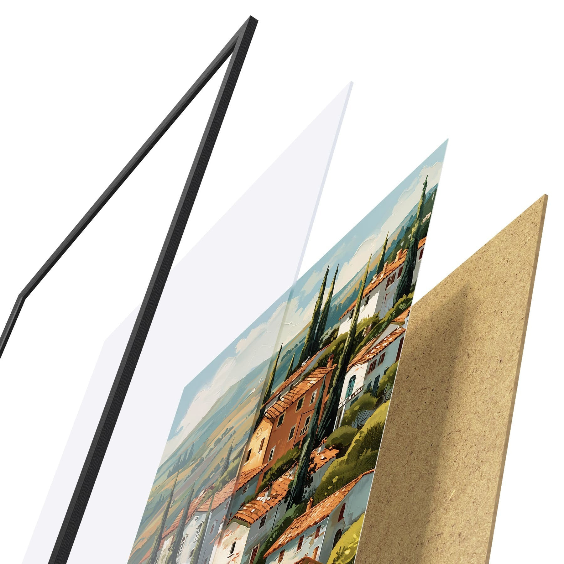 Poster Vahemere mäenõlvadel asuv küla, soojatoonilised majad terrakotta katustega Nr f47951