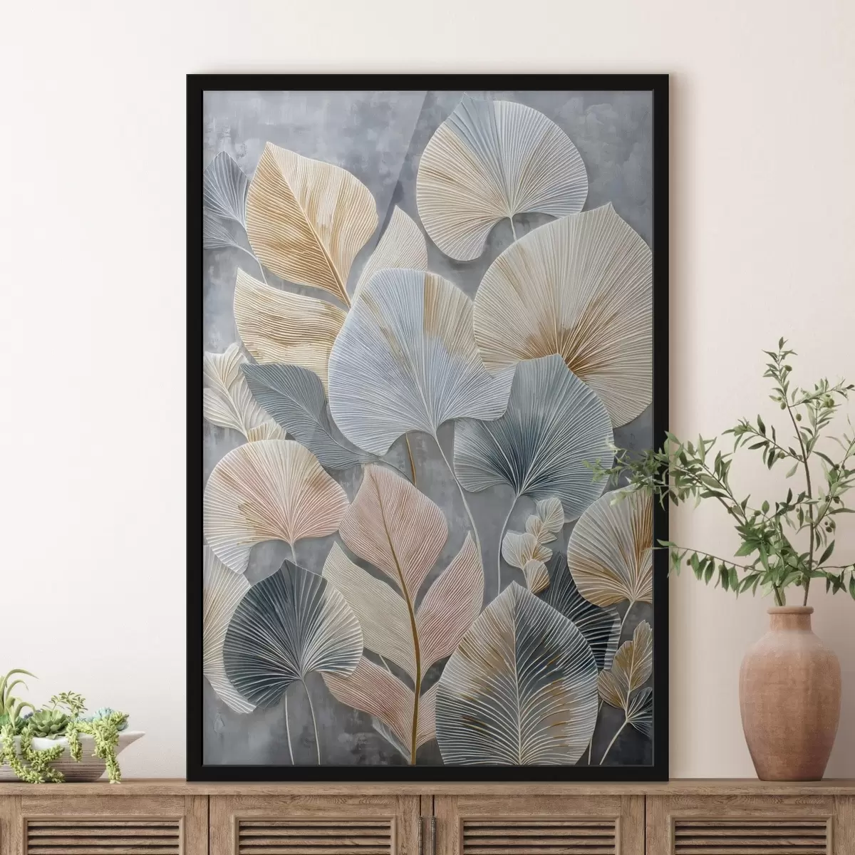 Poster Mitmevärviline dekoratiivne lehestik, millel on selge tekstuur tumedal taustal Nr f47964