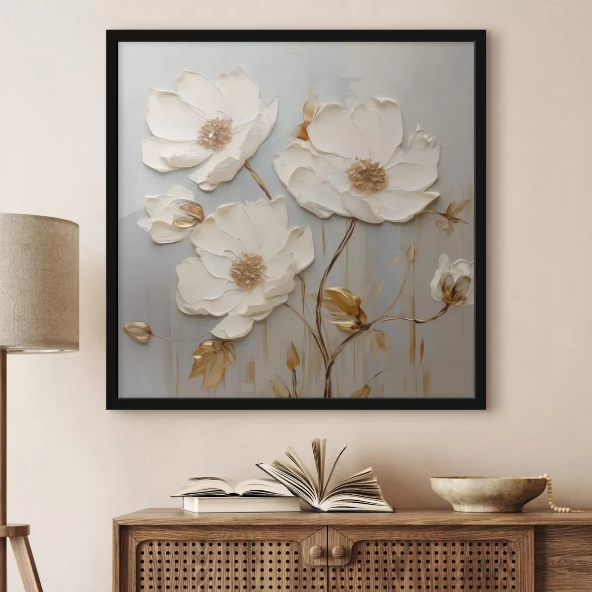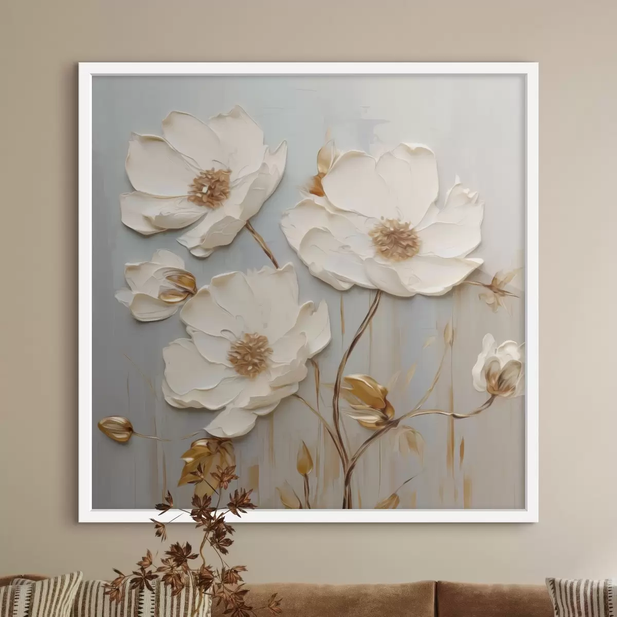 Plakat Reljeefsed valged õied soojade lehtedega f48093