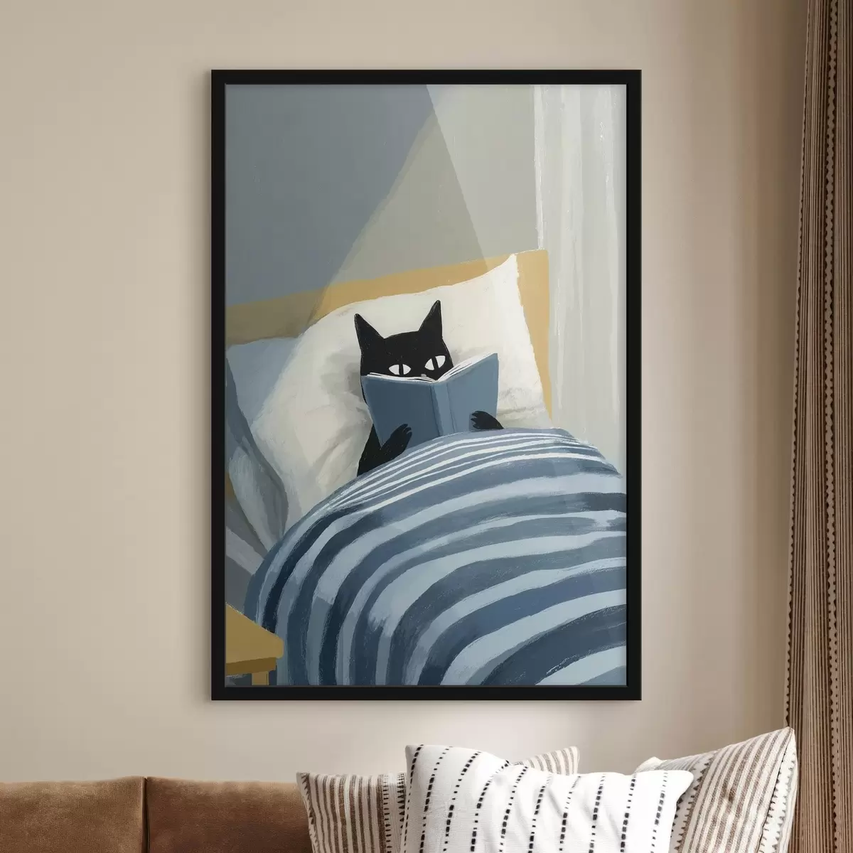 Plakat minimalistlik joonistus mustast kassist, kes loeb voodis raamatut f48117