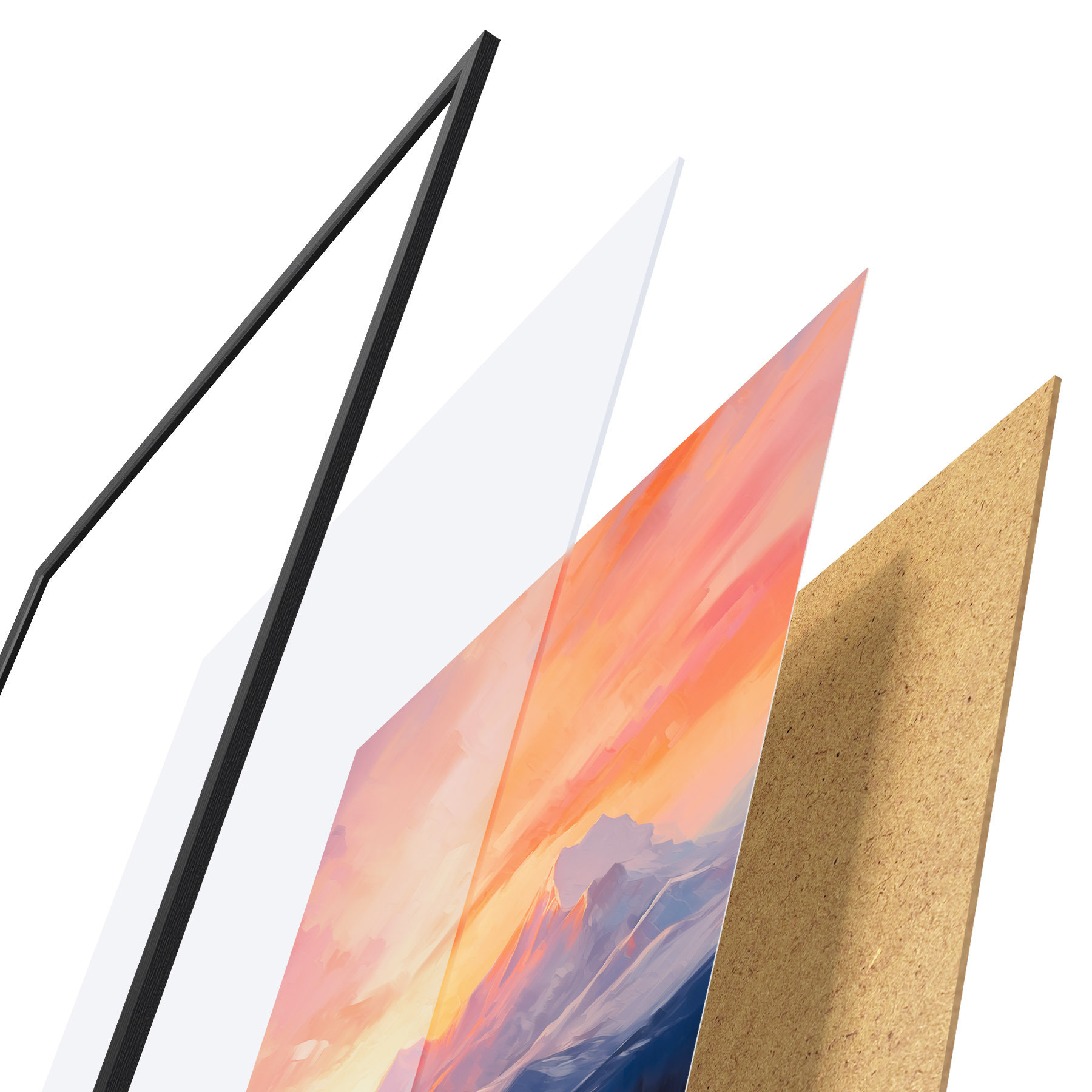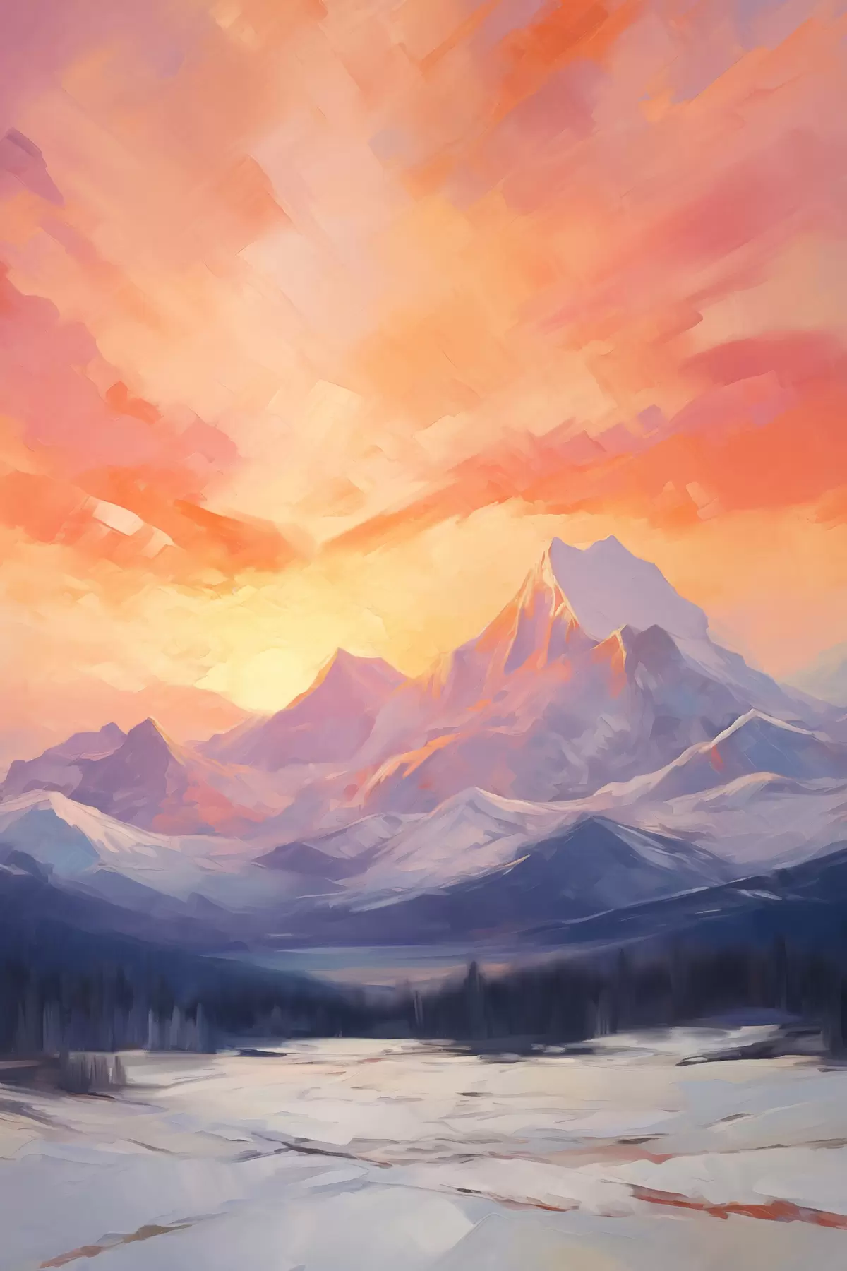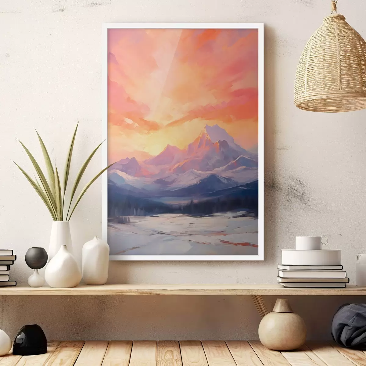 Plakat Lumised mäetipud erksavärvilise oranži ja roosa taeva all, millel ujuvad pilved f48741