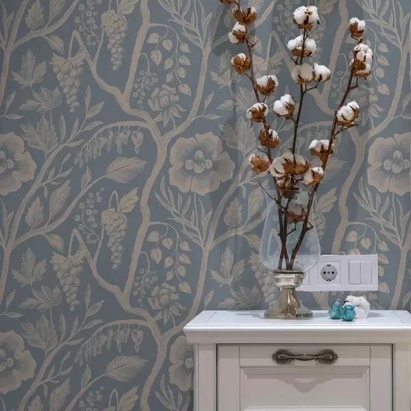 Tapeet Valged lilled, varred ja viinamarjad sinisel taustal a00044