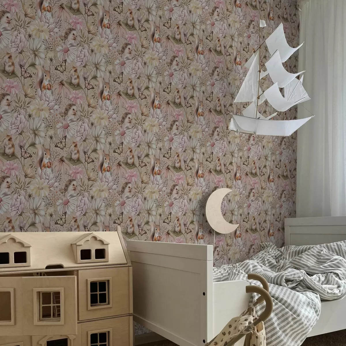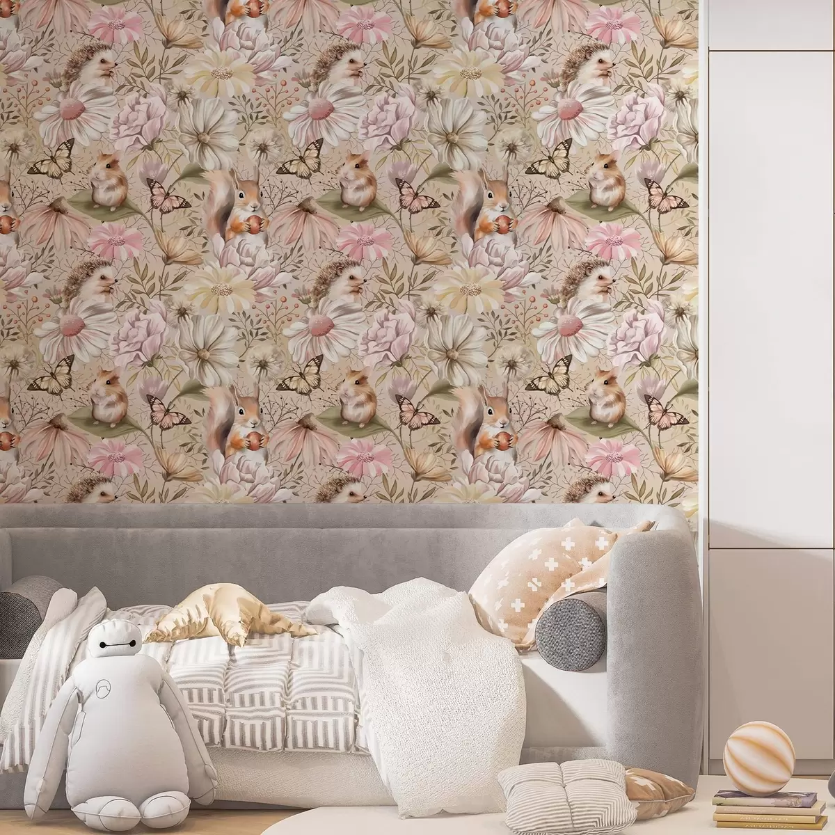 Tapeet Armas siil, orav, hamster ja liblikad koos pastelsete värvidega lilledega Nr. a00051