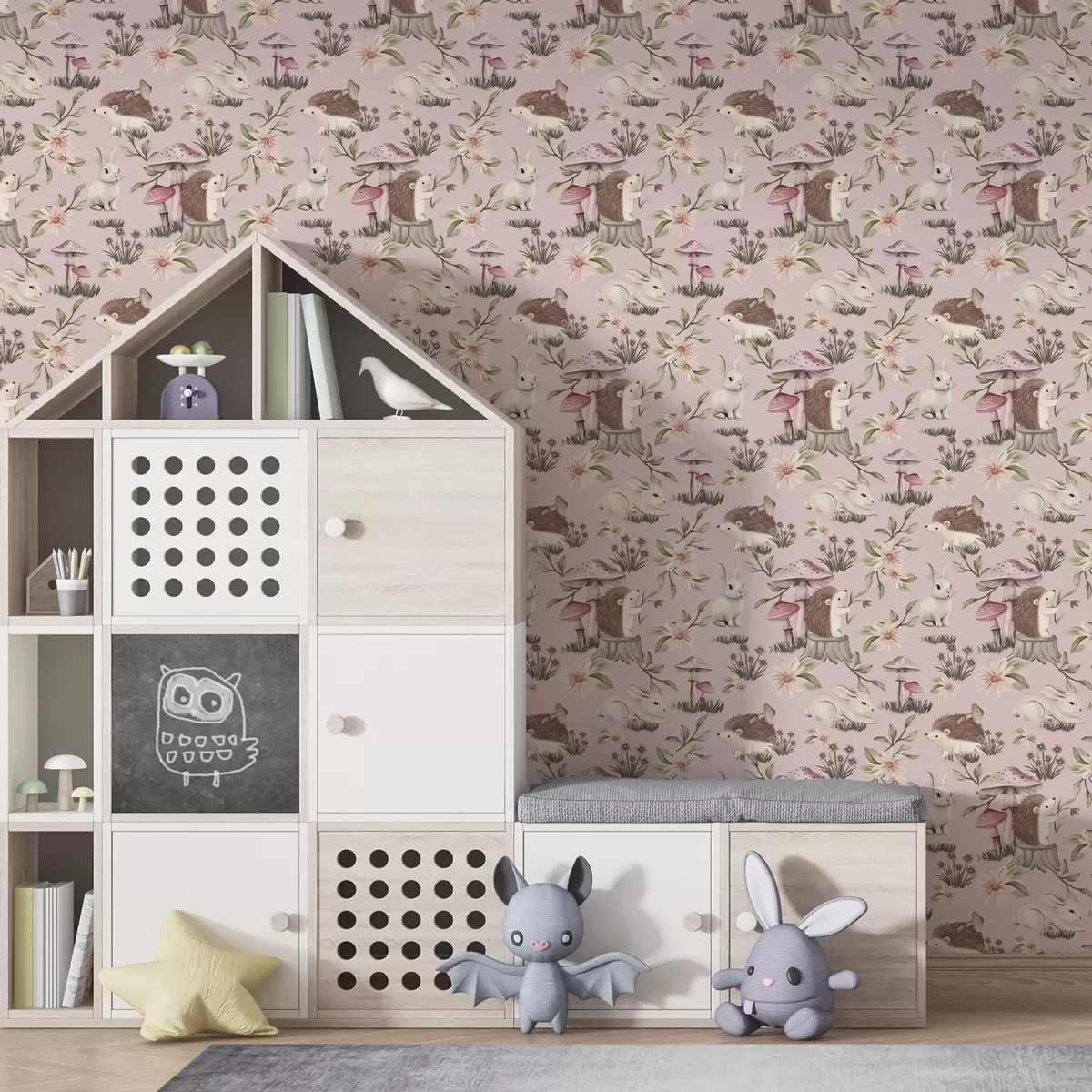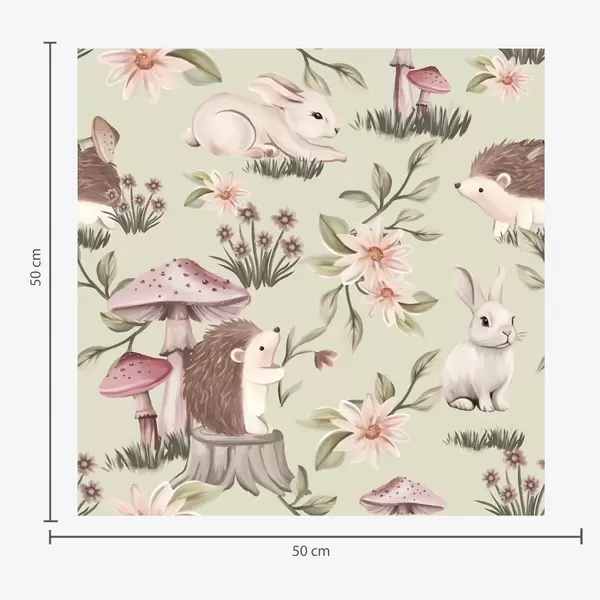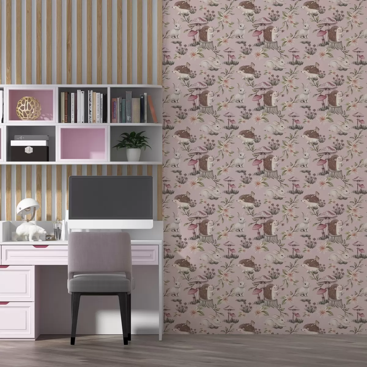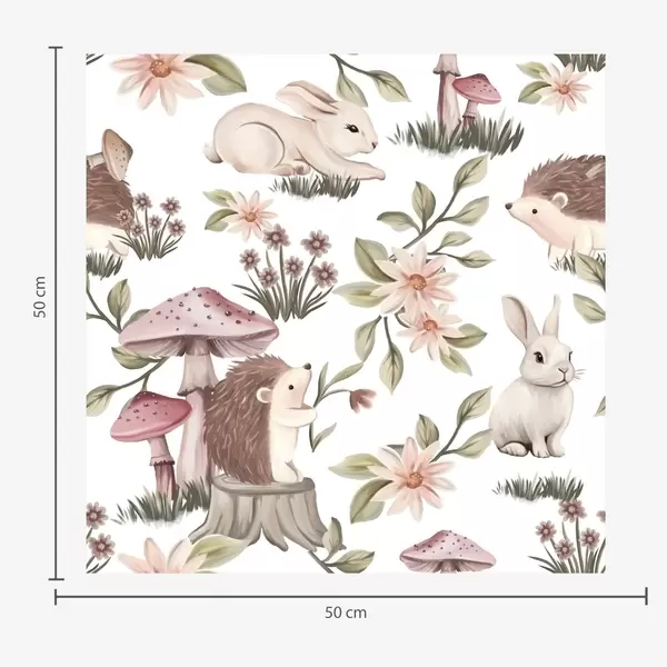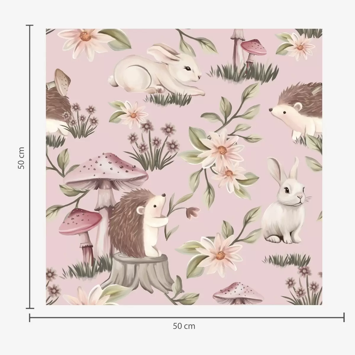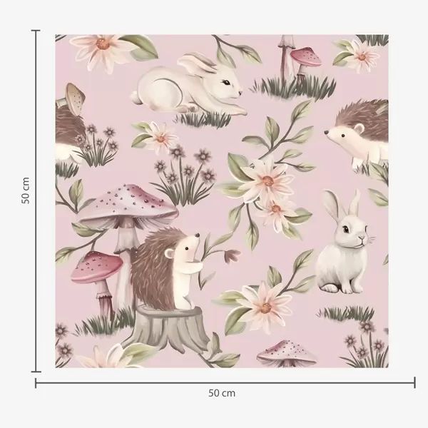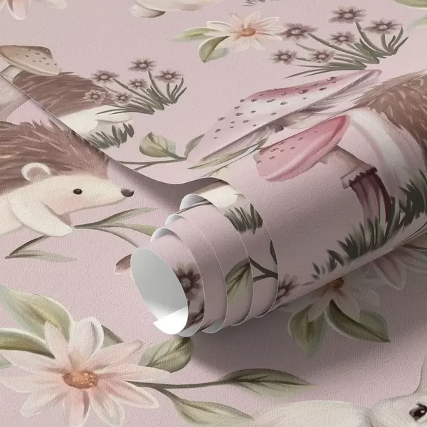 Tapeet Muinasjutu stiilis siilid, jänesed ja lilled seente vahel roosal taustal Nr. a00111