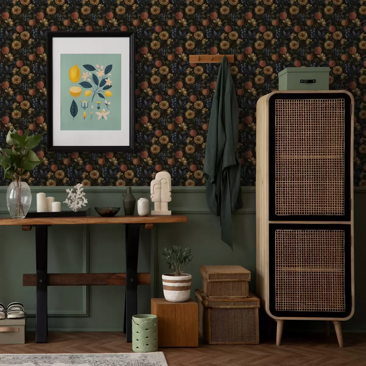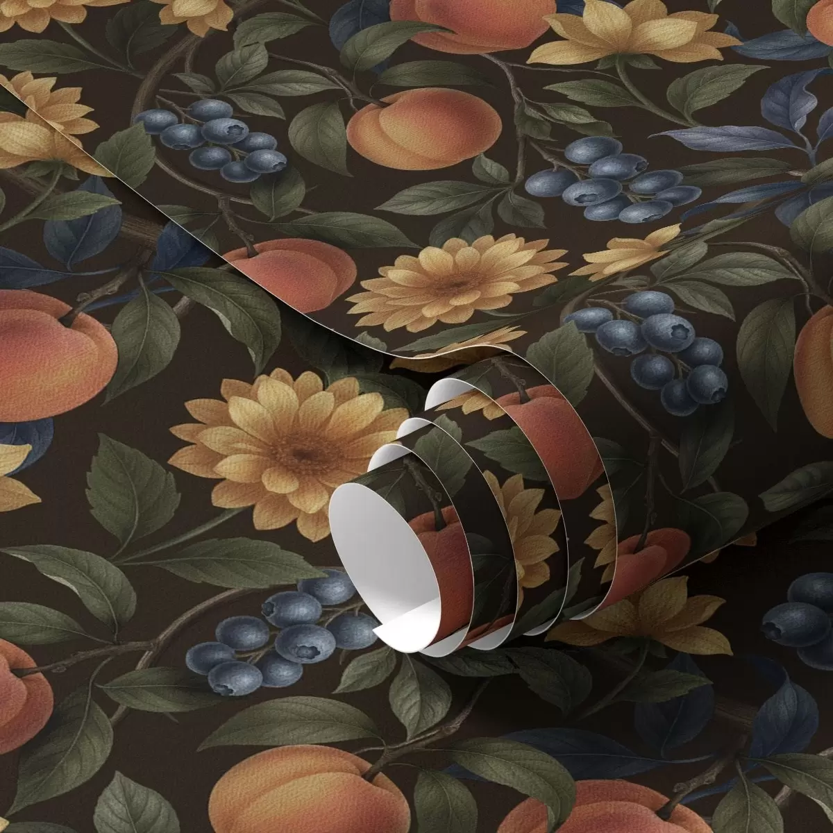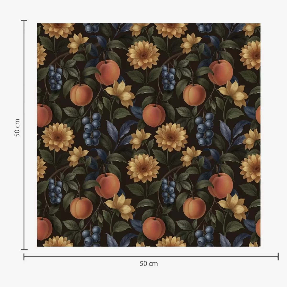 Tapeet Puuviljad ja kollased lilled tumedal botaanilisel taustal Nr. a00395