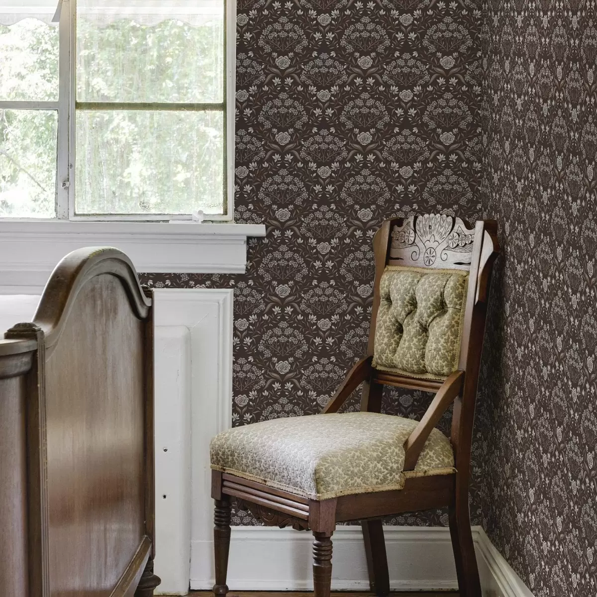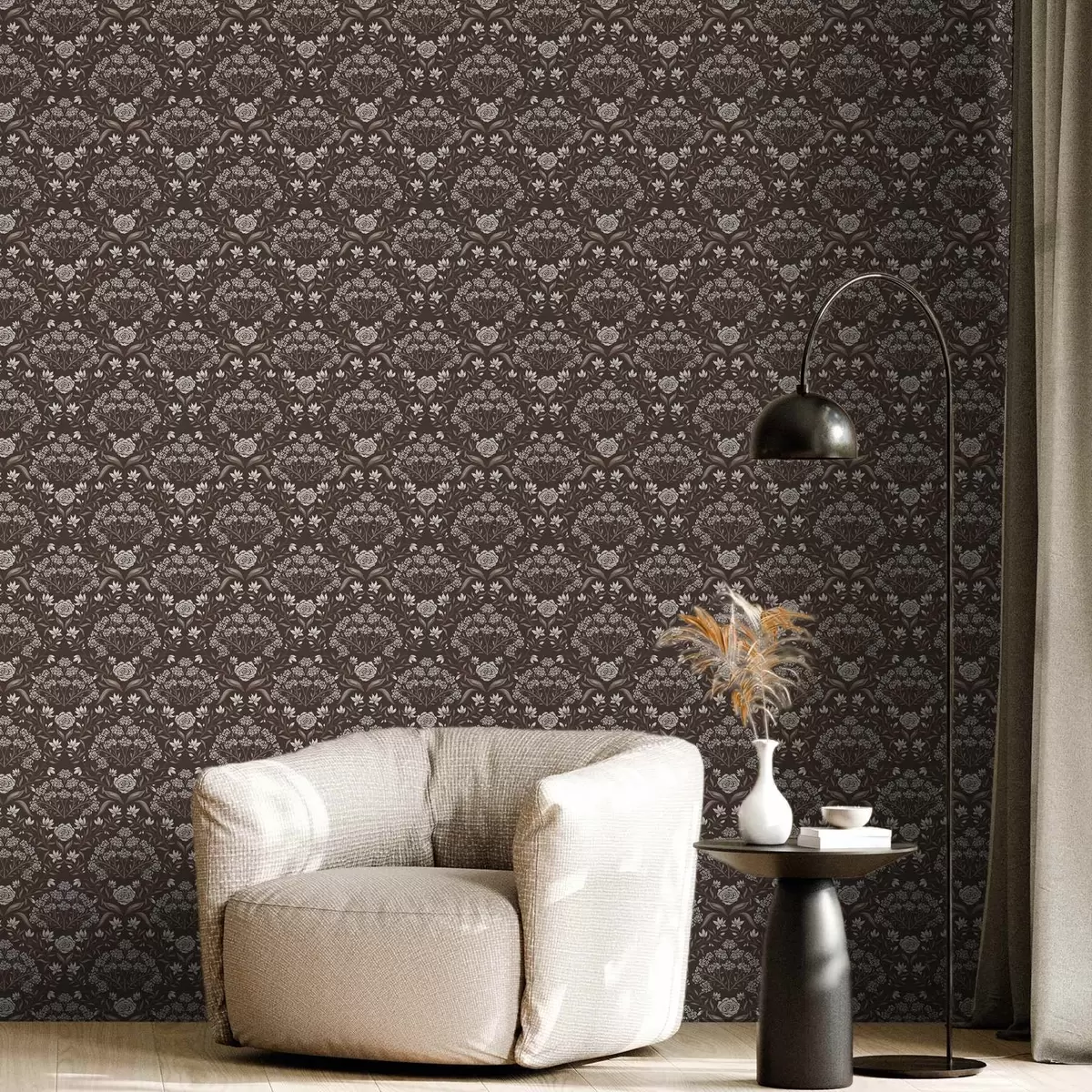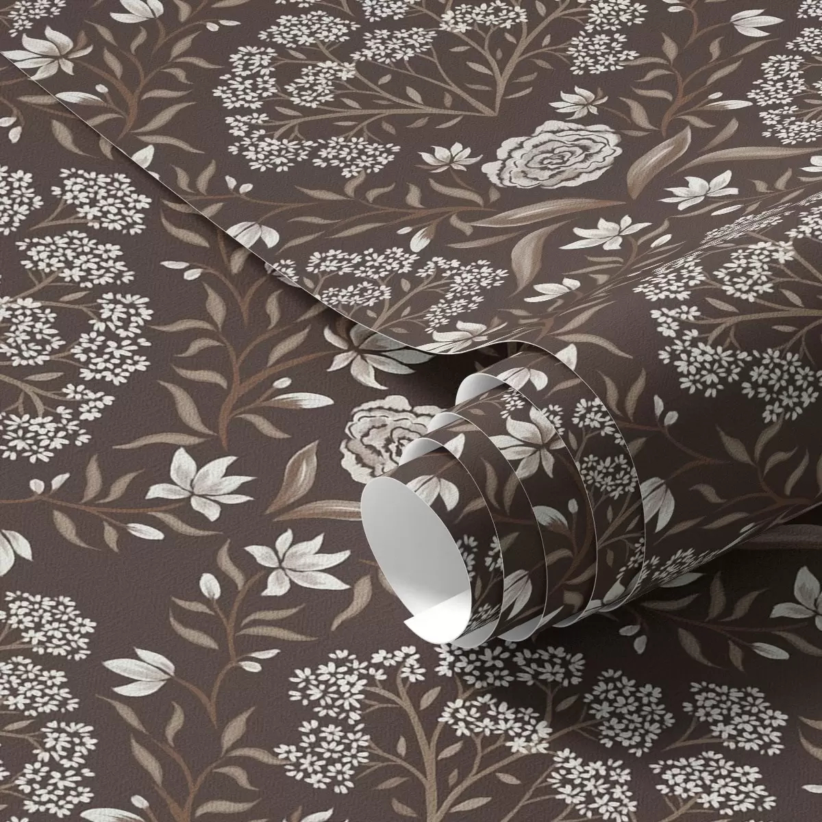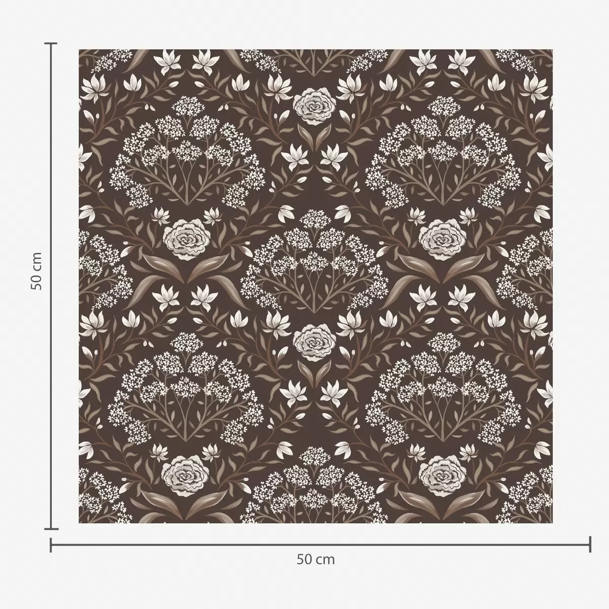 Tapeet Tume šokolaad damask koos peonide ja lumikellukestega a00603v2