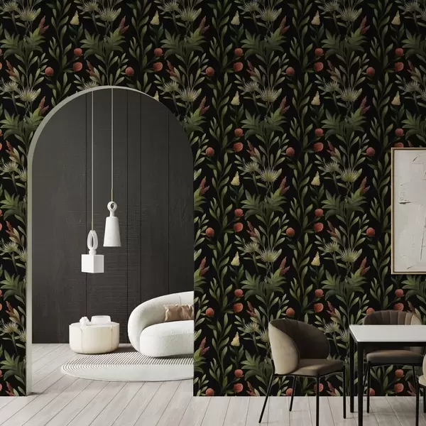 Tapeet Kõrged rohttaimed ja õied mustal, detailsel trükil a00620