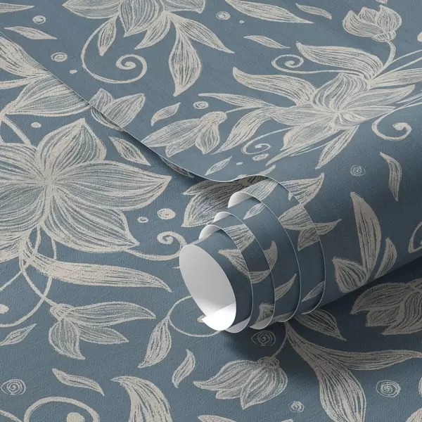 Tapeet Sinisel taustal kreemikad lineaarsed lilled, õrnad keerud Nr. a00630