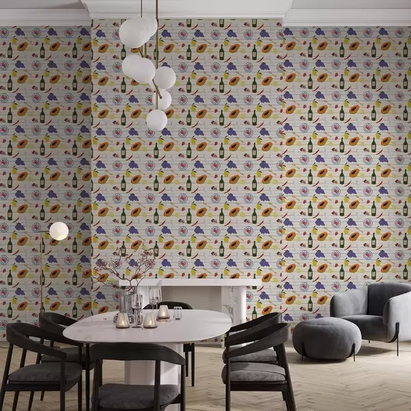 Tapeet Köögiteema trükis puuviljade, klaaside ja taldrikutega Nr. a00638