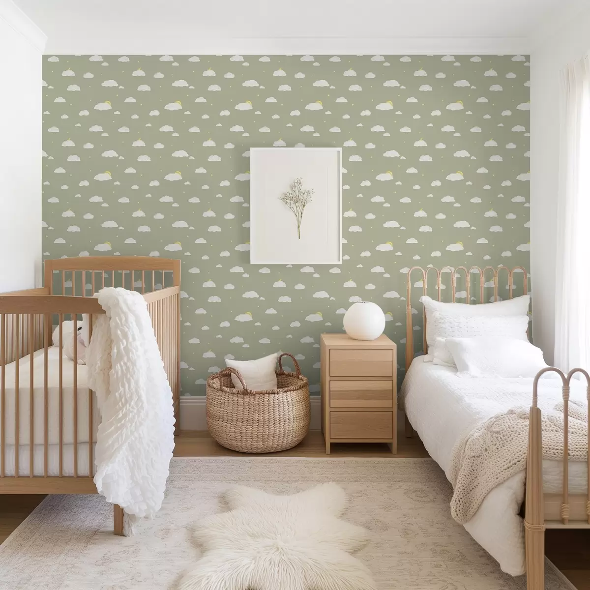 Tapeet Pehmed pilved, tähed ja päike rohekashalli taustal Nr. a00652v1