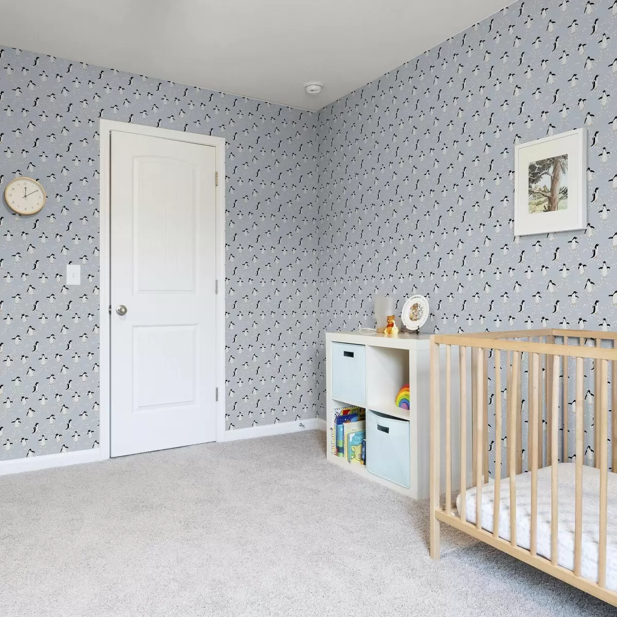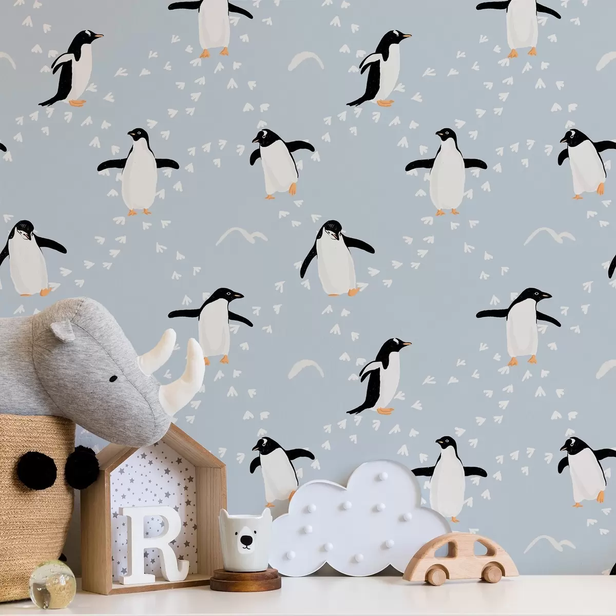 Tapeet Pingviinid helesinisel taustal, jalajälgede rütm Nr. a00655v2