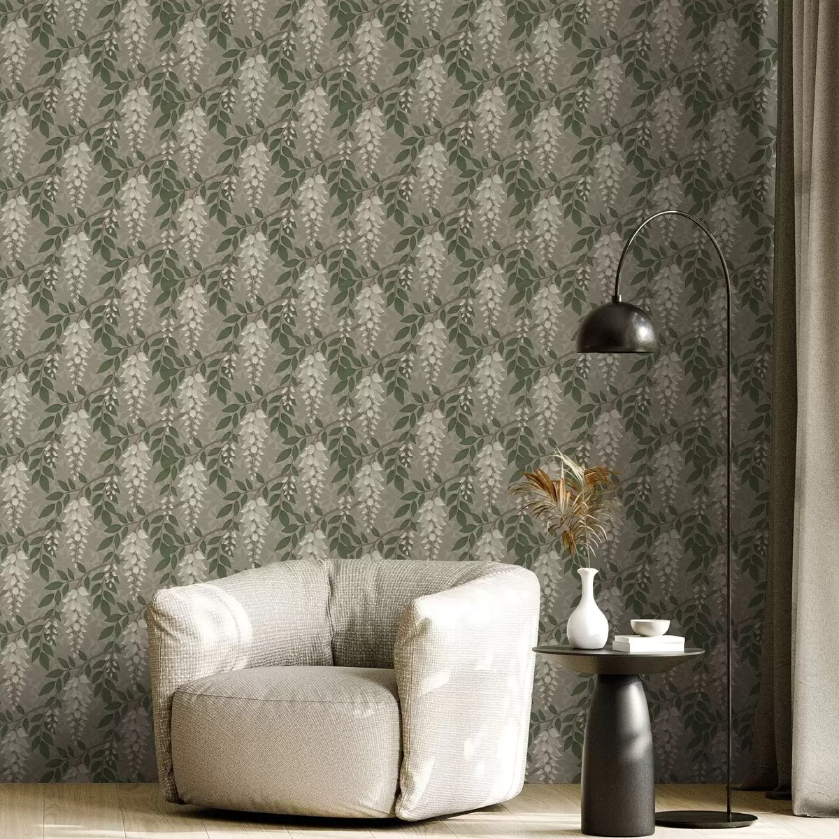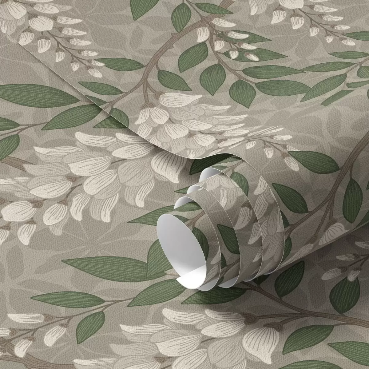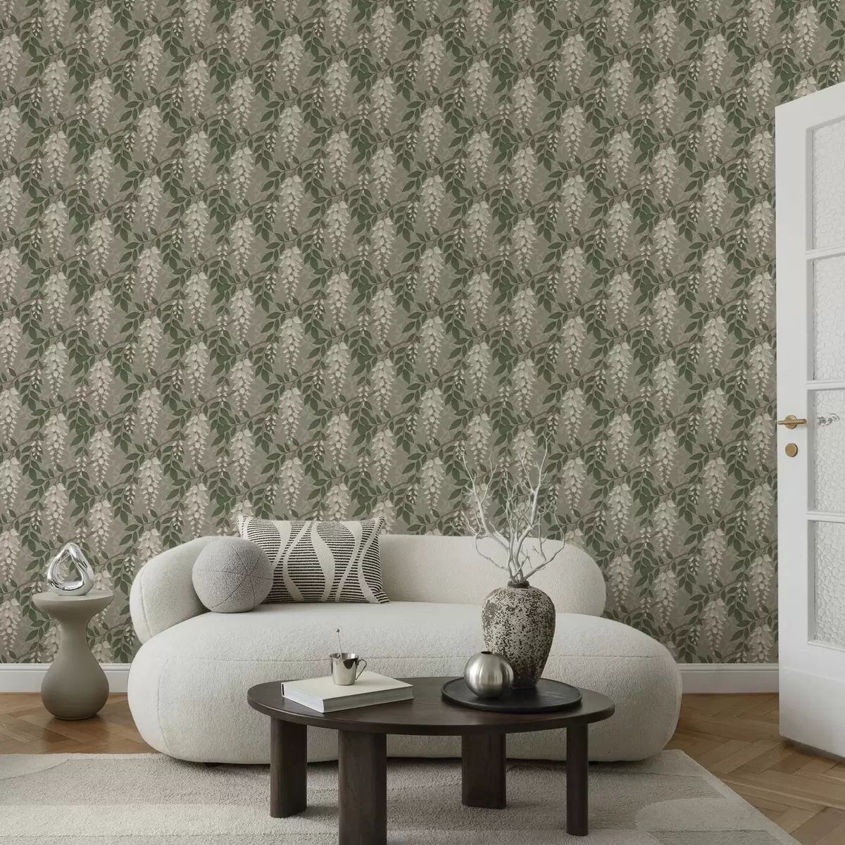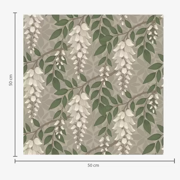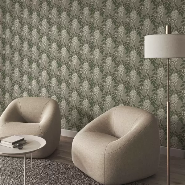 Tapeet Hele wisteria halli-oliivirohelisel taustal, kosejad klastrid Nr. a00694