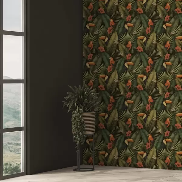 Tapeet Tukaan ja papagoid troopiliste lehtede ja lillede keskel Nr. a00702