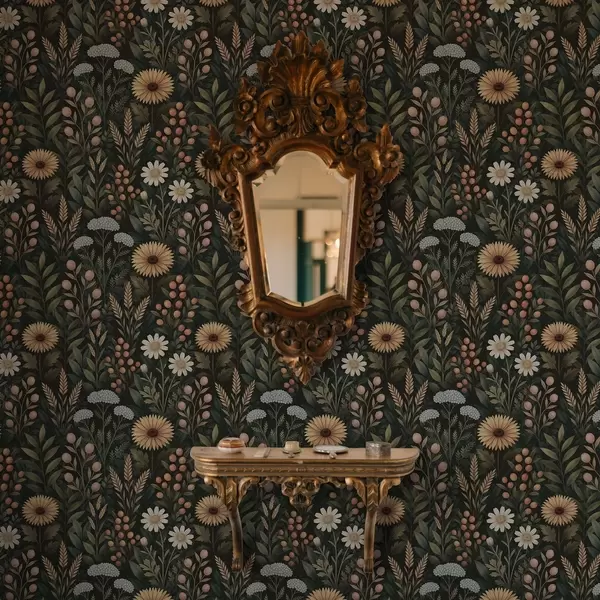 Tapeet Looduslikud lilled ja marjad tumedal taustal, looduslik ornament Nr. a00707