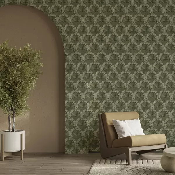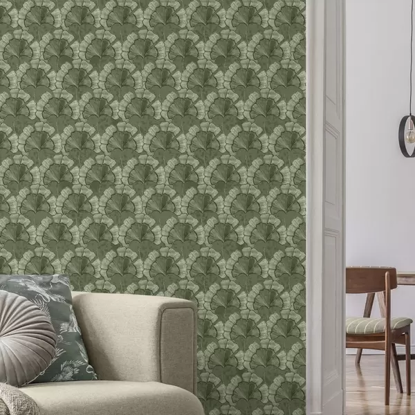 Tapeet Graafiline muster ginkgoga jahedas rohelises värvipalettis Nr. a00709