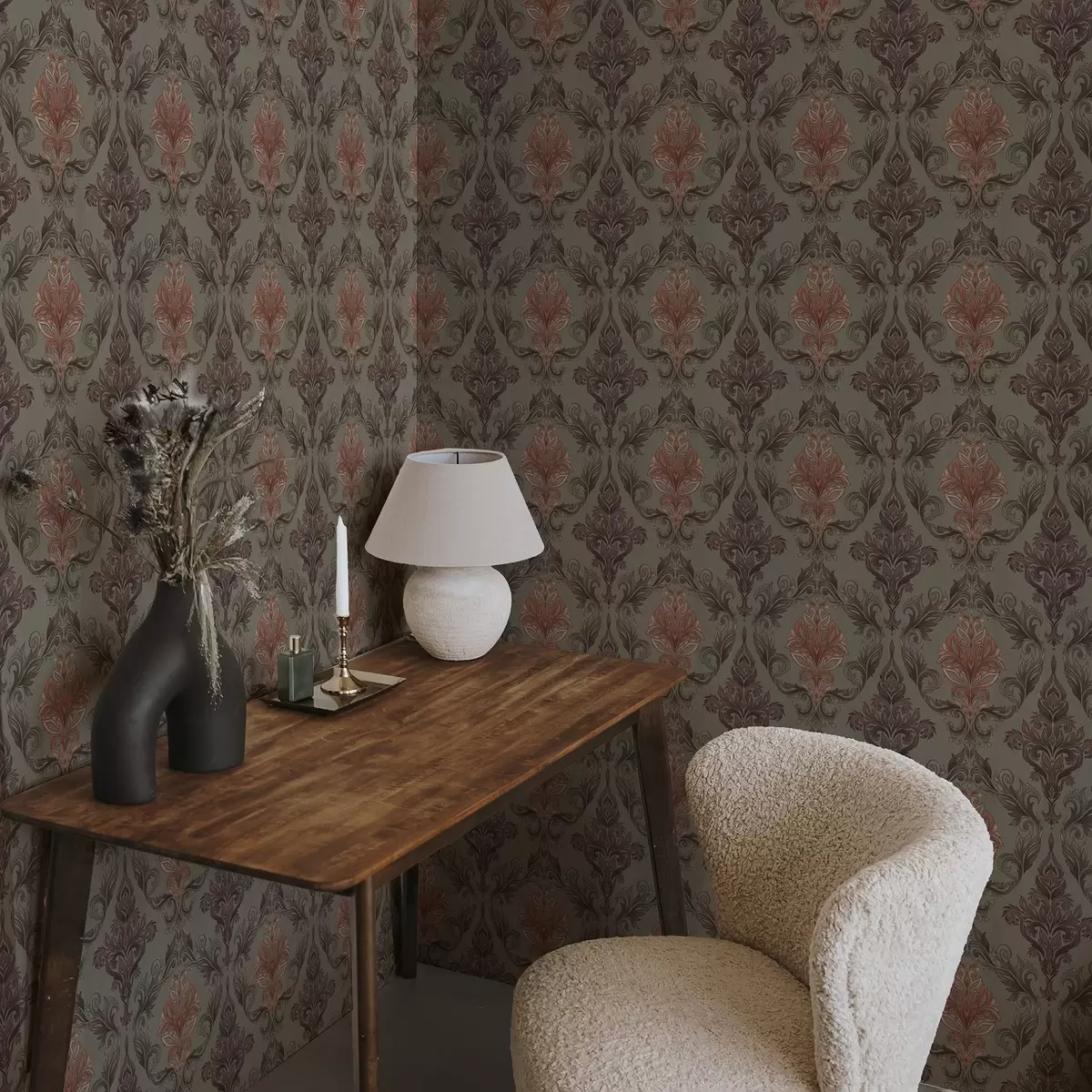 Tapeet Terrakotta damask vaoshoitud oliivirohelisel taustal Nr. a00828v3