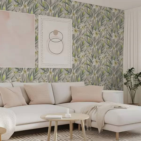 Tapeet Kreemikad liiliad lehtedega hallikaspruuni taustal Nr. a00837