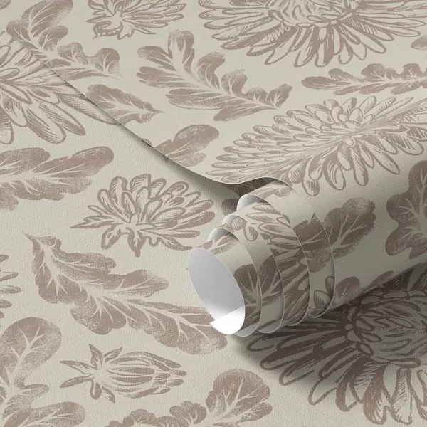 Tapeet Krüüsanteemid ja tamme lehed pehmes beež-pruunis toonis Nr. a00840
