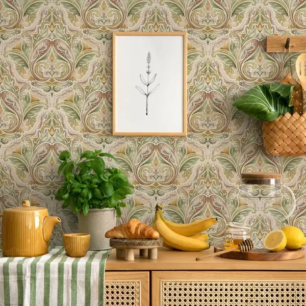 Tapeet Vesivärviga maalitud lehtede keerud rohelistes ja soojades okra toonides Nr. a00927