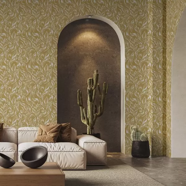 Tapeet Kreemvalge leheornament soojal okra taustal Nr. a00940v1