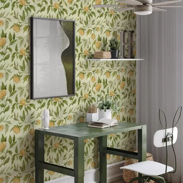 Tapeet Kollased pioonid ja lehed pehme helerohelisel taustal Nr. a00942