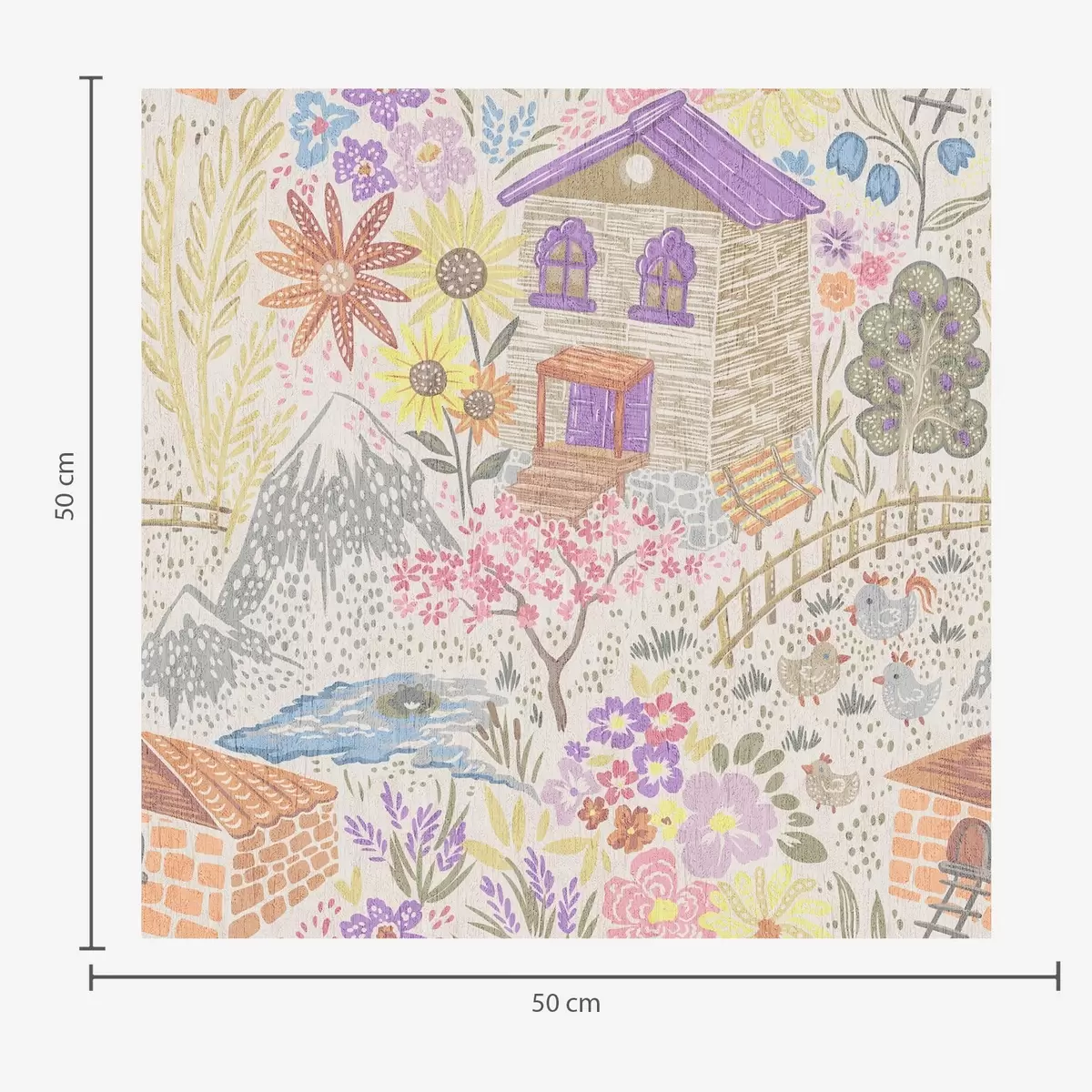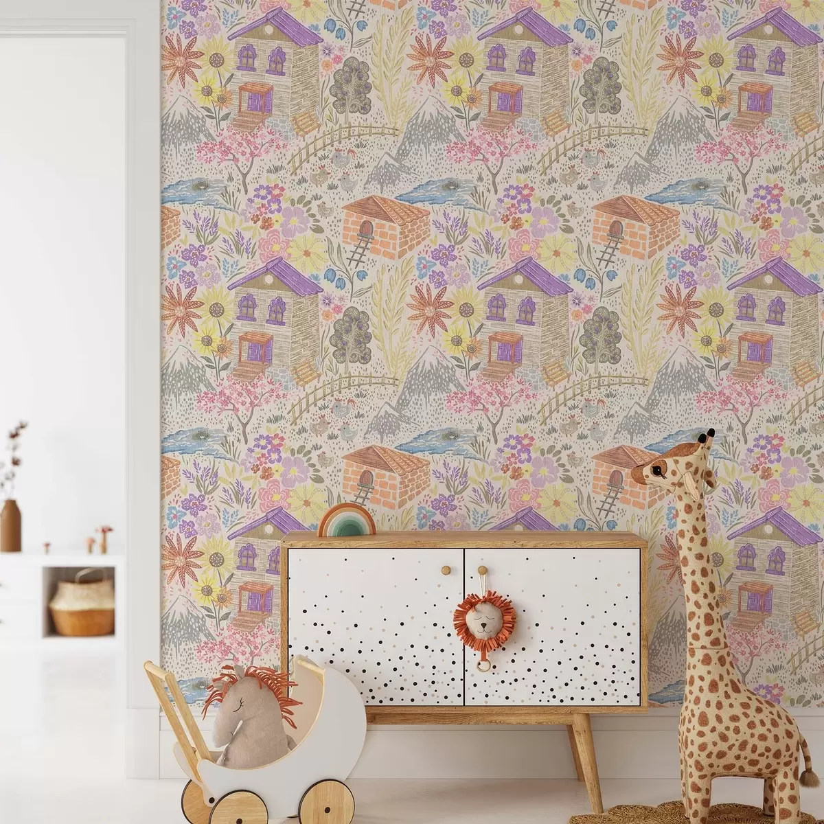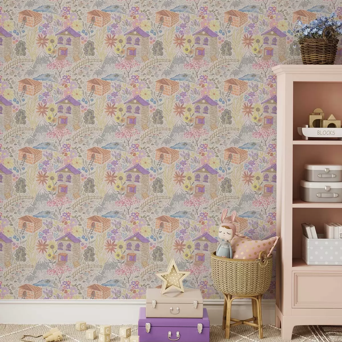 Tapeet Lapsepärase külajoonisega maja, mäed ja lilled Nr. a00952