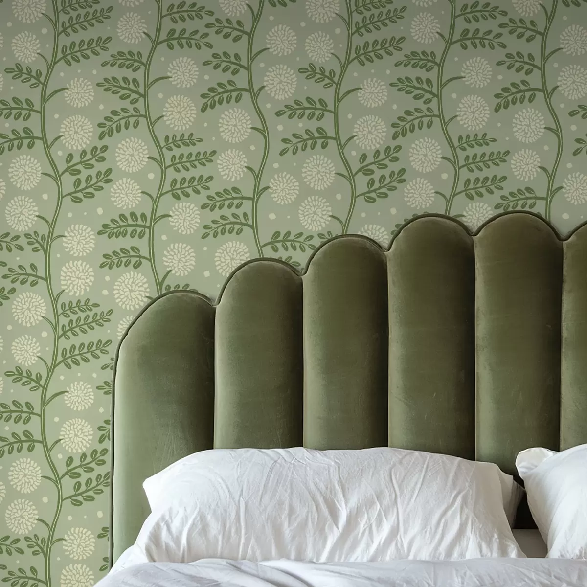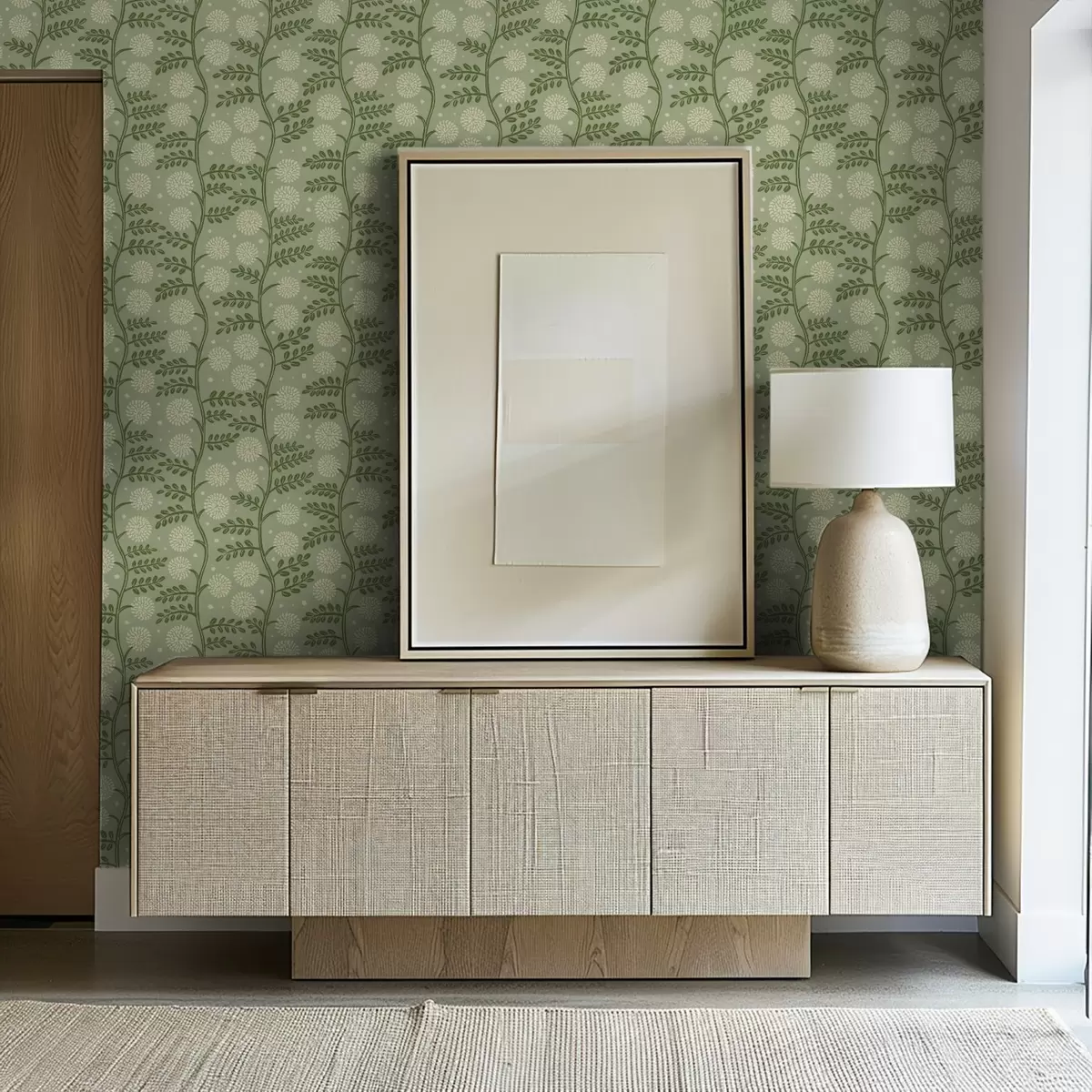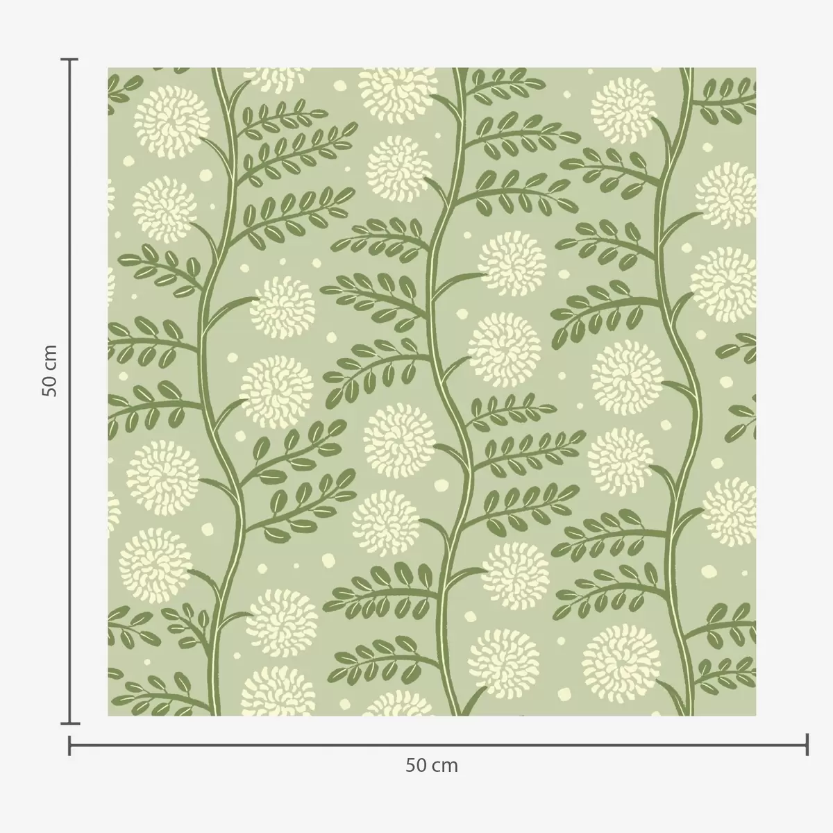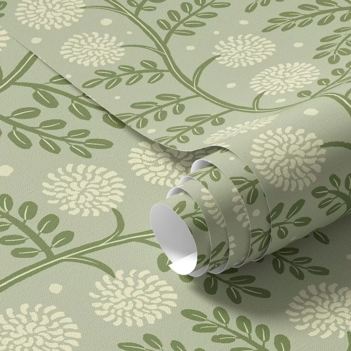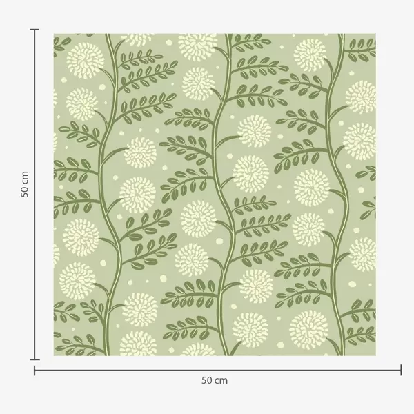Tapeet Salvei-rohelised varred, millel on elevandiluu värvi kohevad õied ja täpid Nr. a00997v2