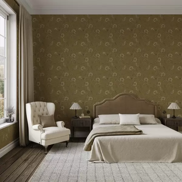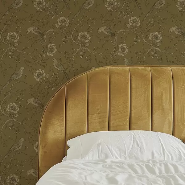 Tapeet Vintage linnud ja lilled soojal oliivirohelisel taustal Nr. a01022v1