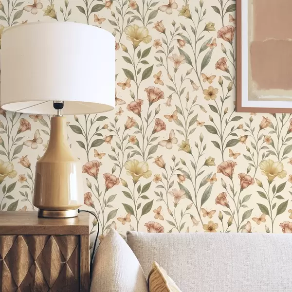 Tapeet Õrnad virsikuõied ja liblikad soojal kreemikal taustal a01026