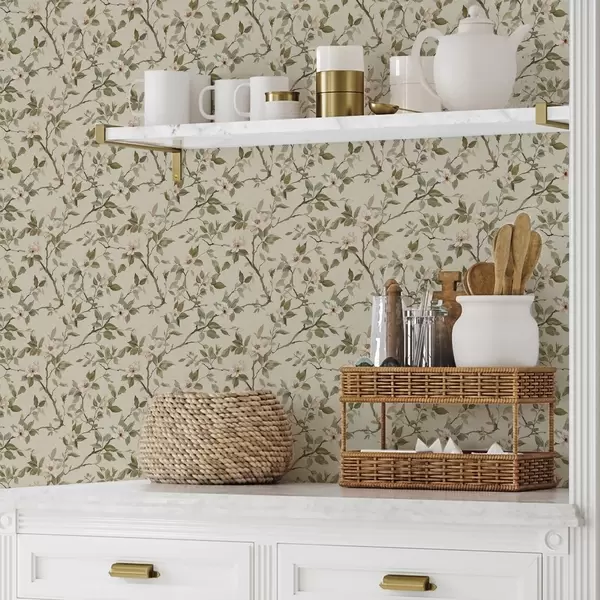 Tapeet Kerged oksad väikeste kreemikate õitega ja roheliste lehtedega Nr. a01028