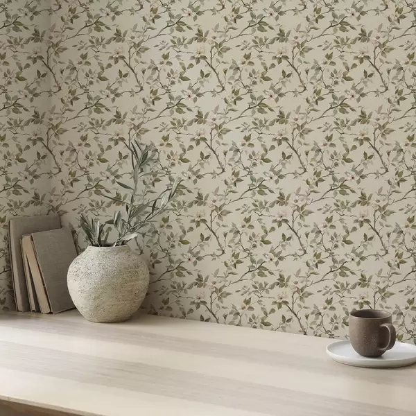 Tapeet Kerged oksad väikeste kreemikate õitega ja roheliste lehtedega Nr. a01028