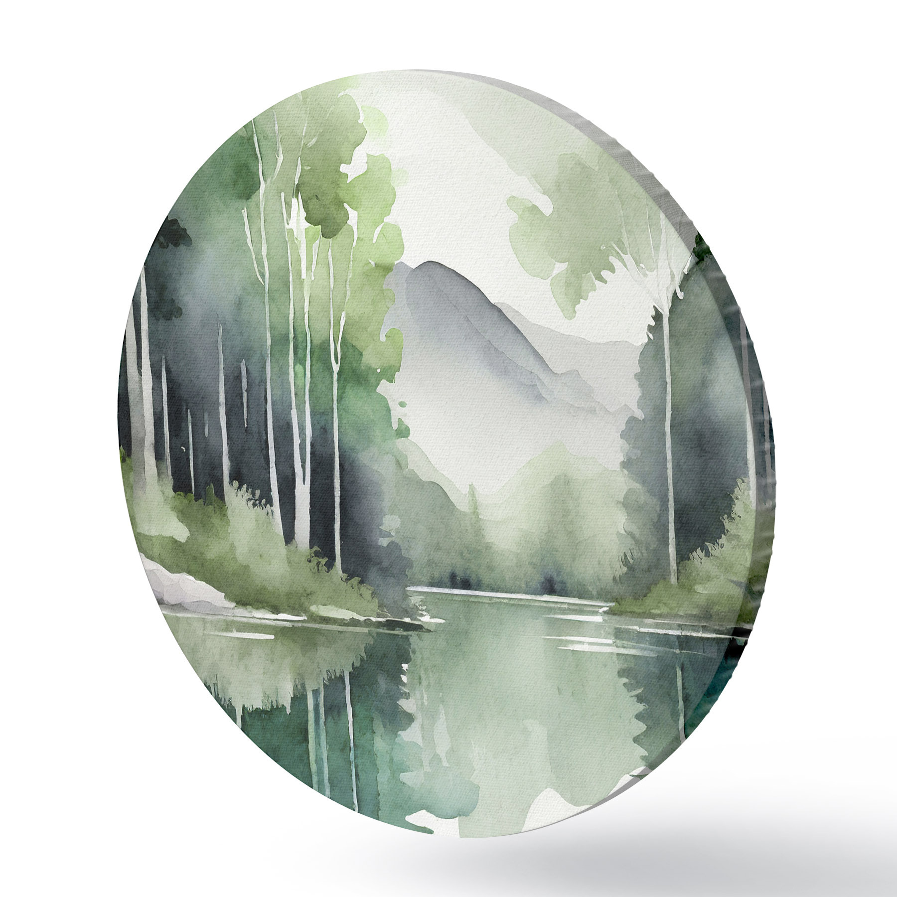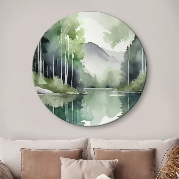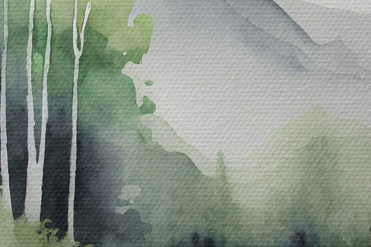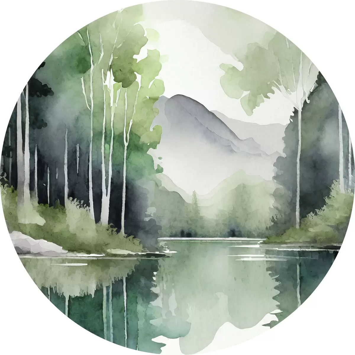 Pilt Akvarellmaastik järve ja metsaga, kevad, looduslikud rohelised pehmed värvid Nr r36503
