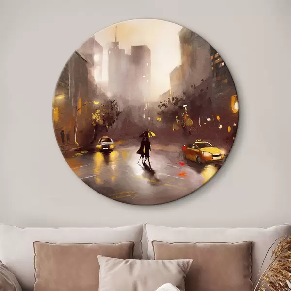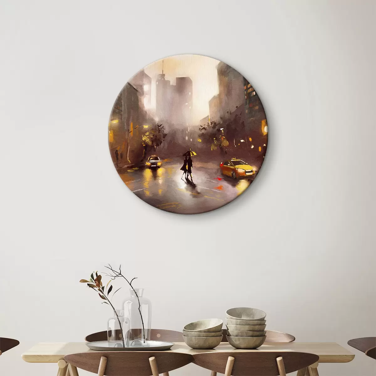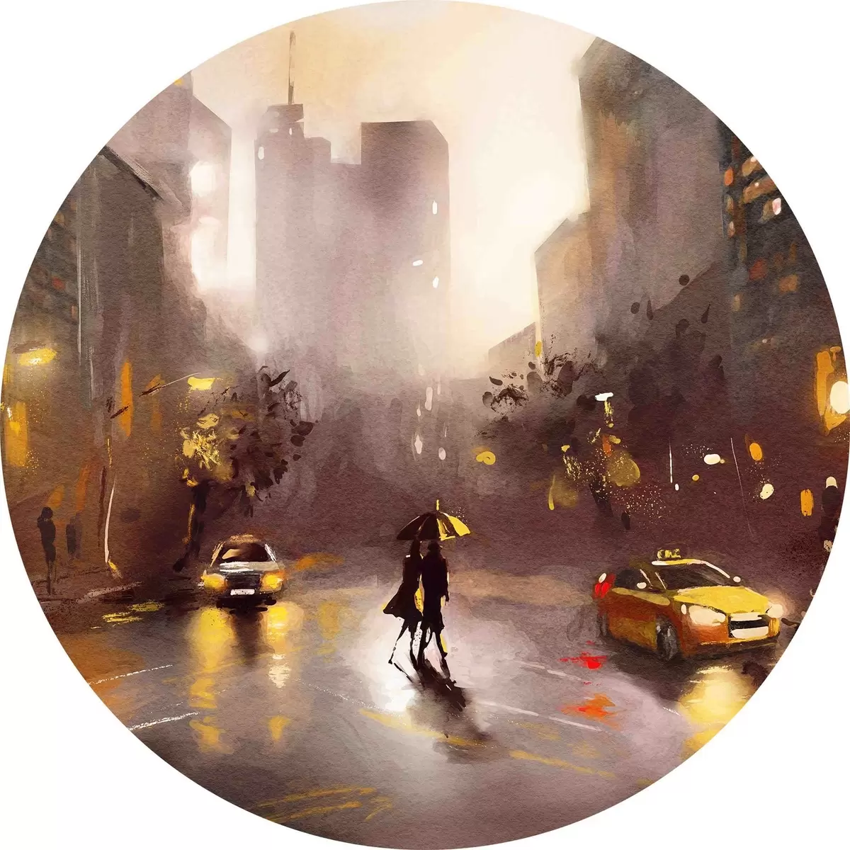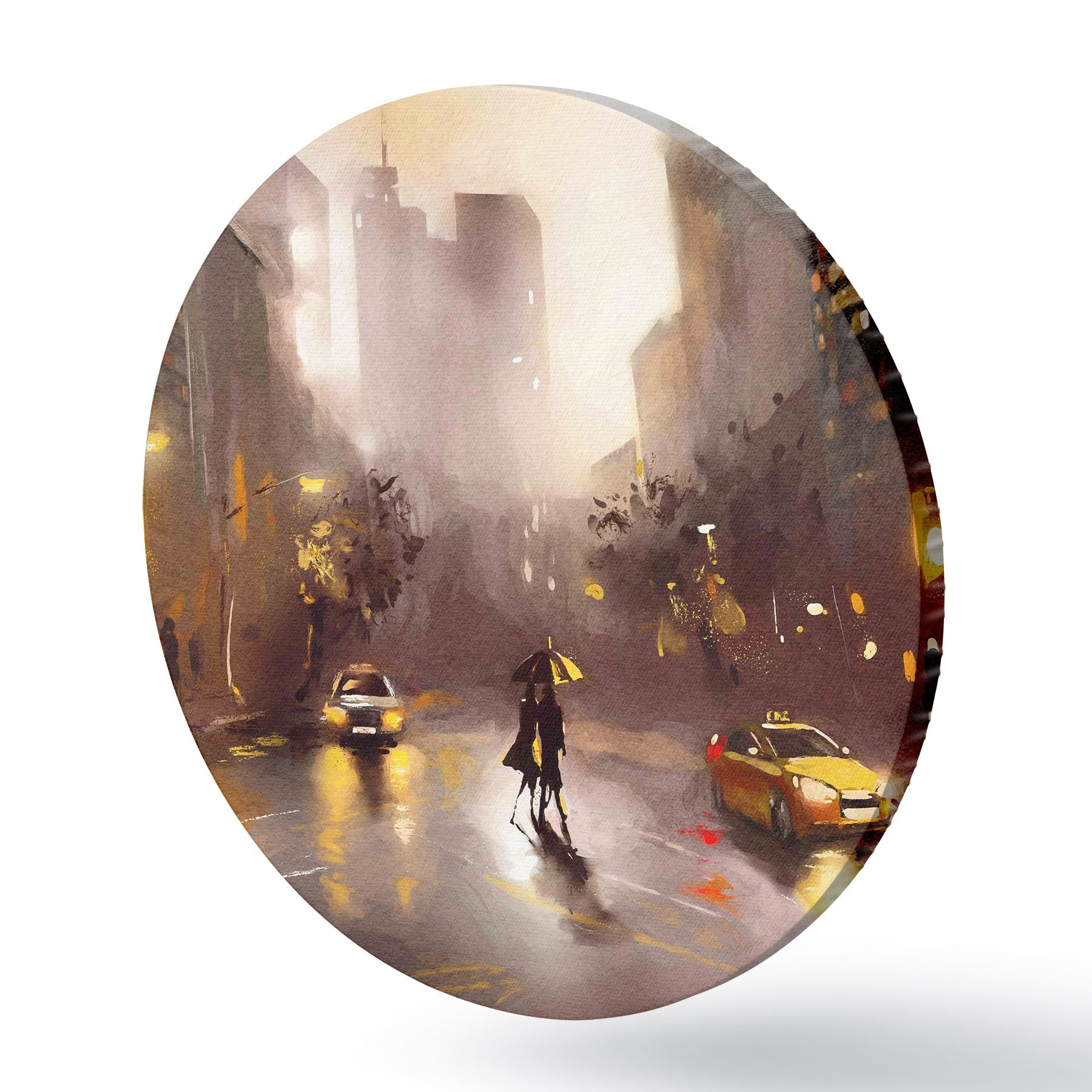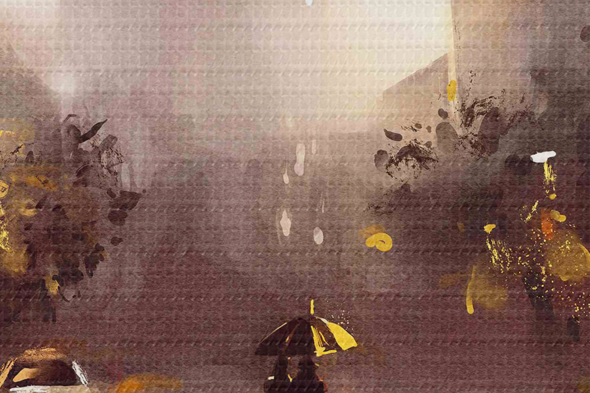Pilt Vihmavarjuga inimene kõnnib märjal tänaval koos autode ja hoonetega Nr r36600