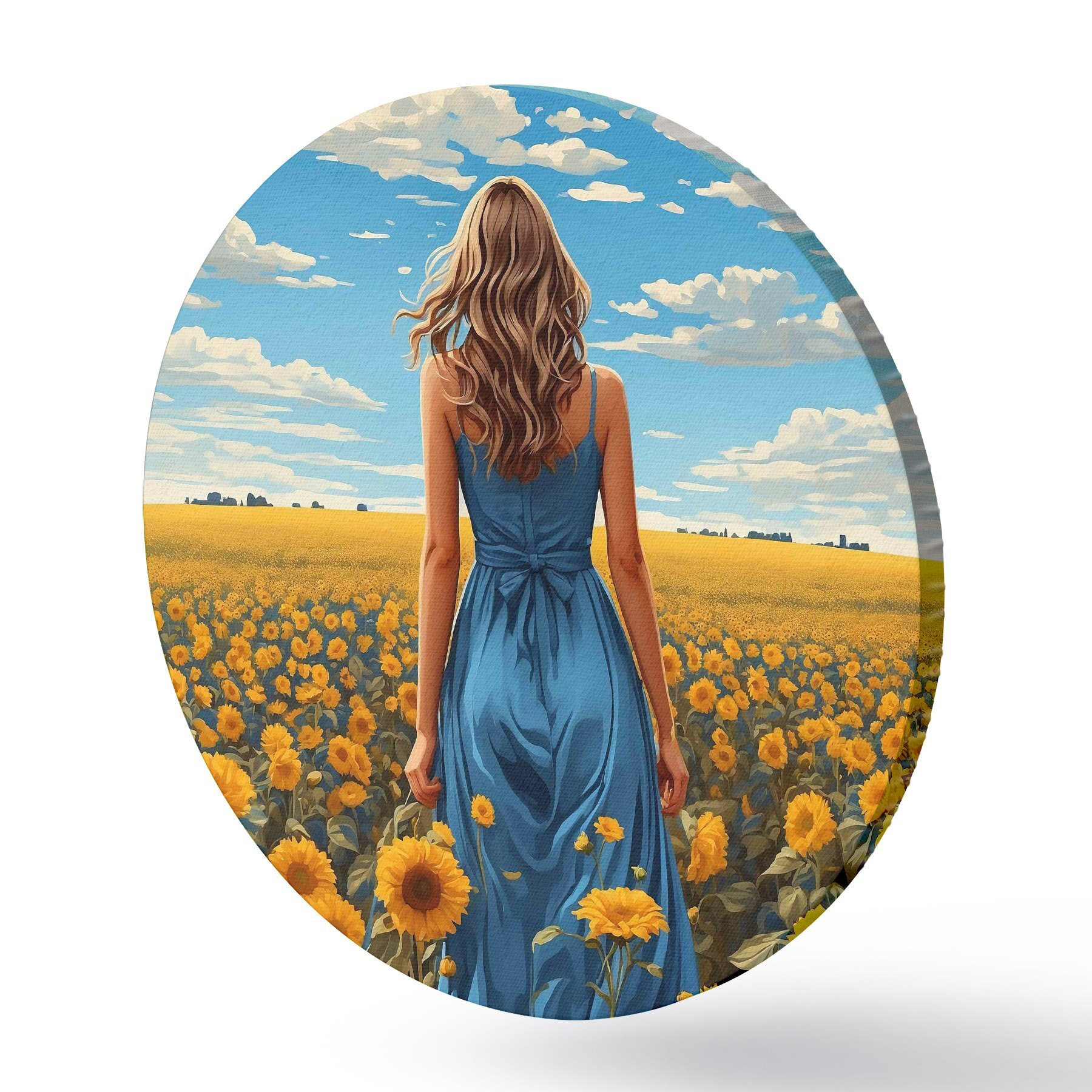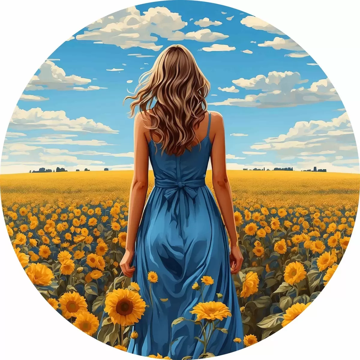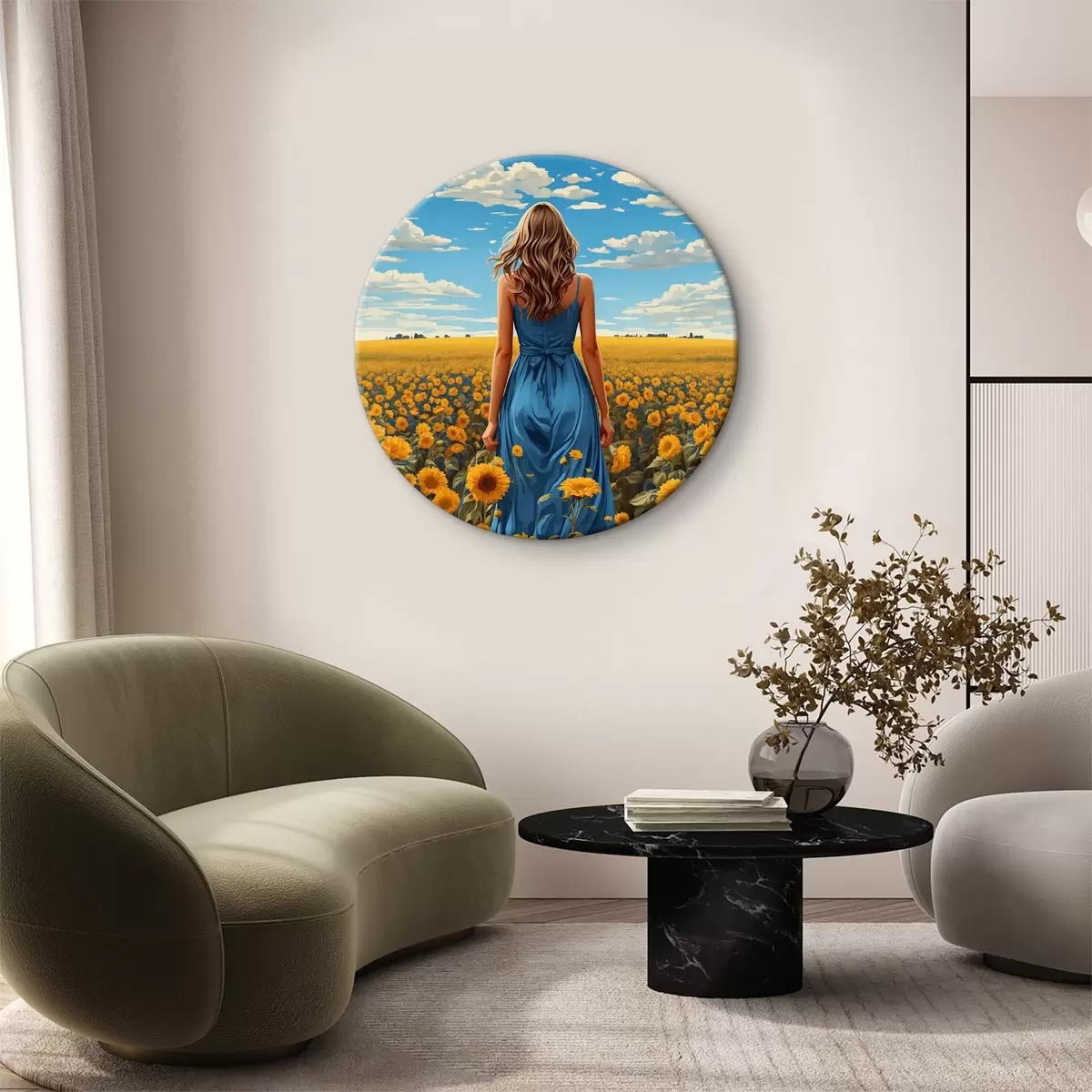 Pilt Sinise kleidiga naine päevalilleväljal Nr r37164
