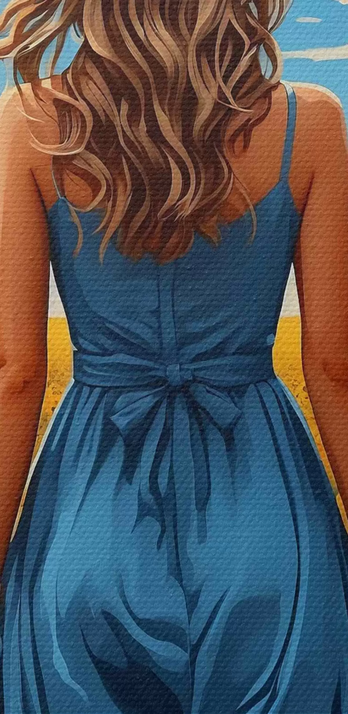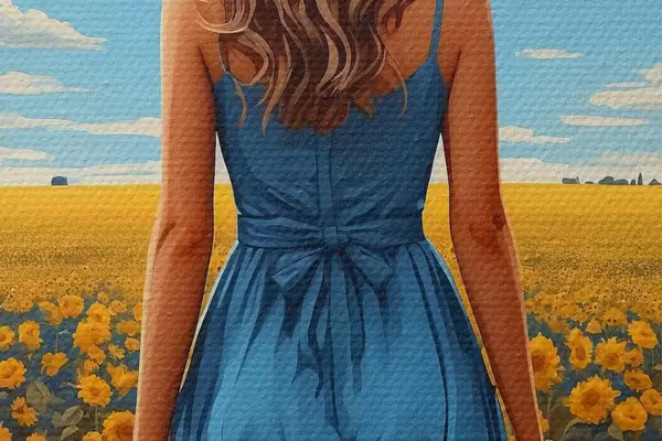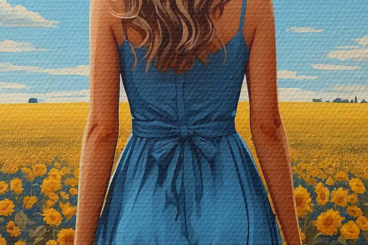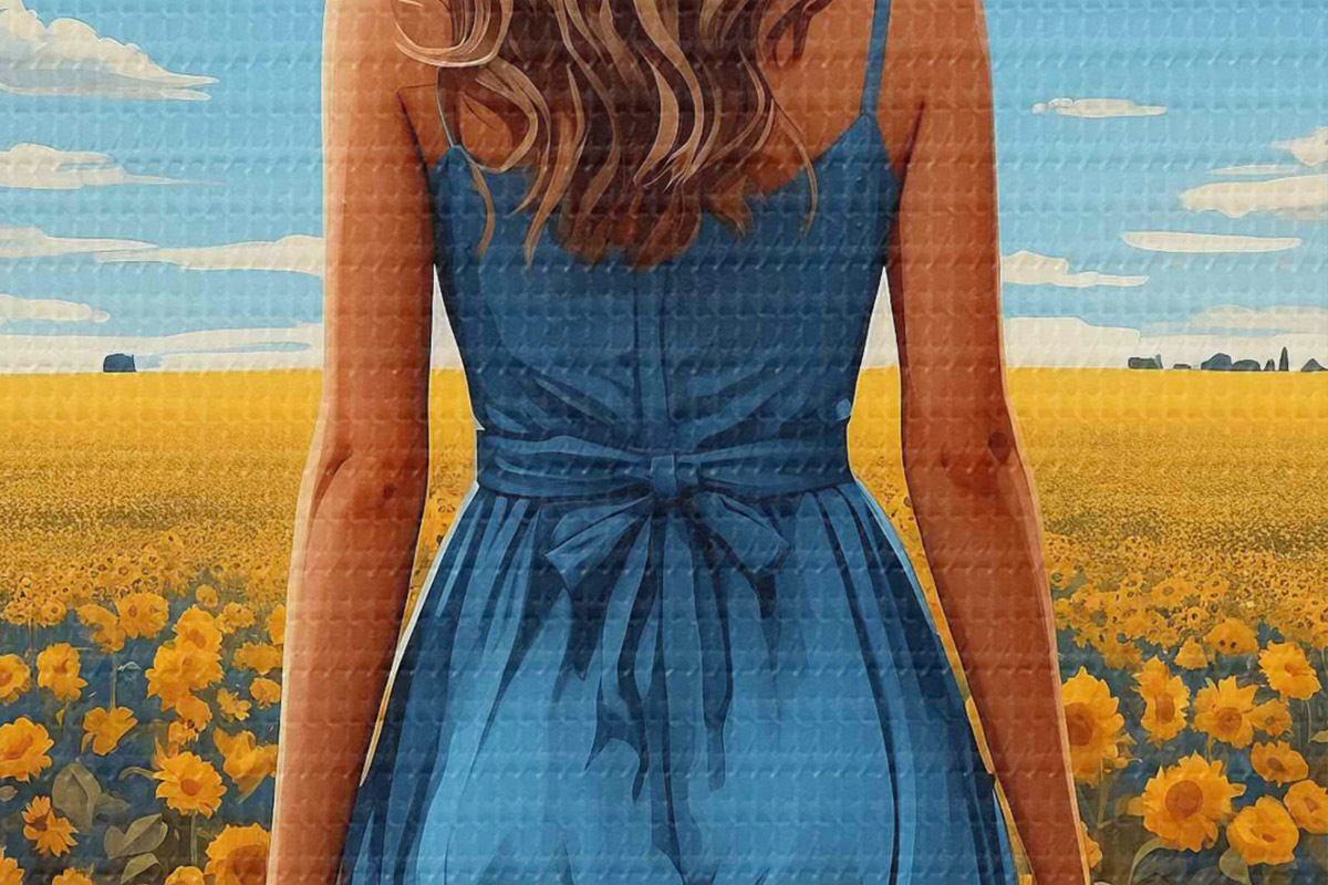 Pilt Sinise kleidiga naine päevalilleväljal Nr r37164