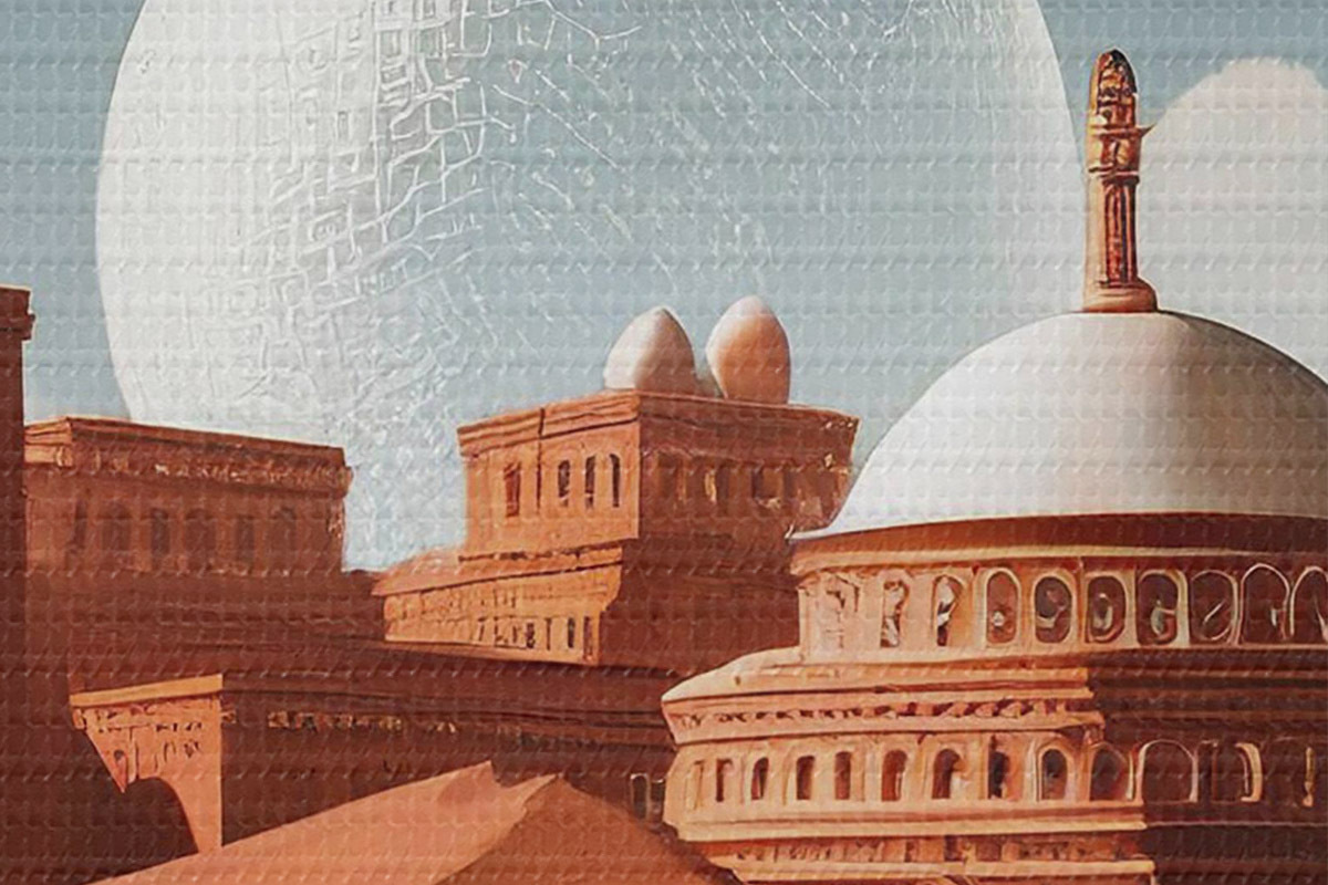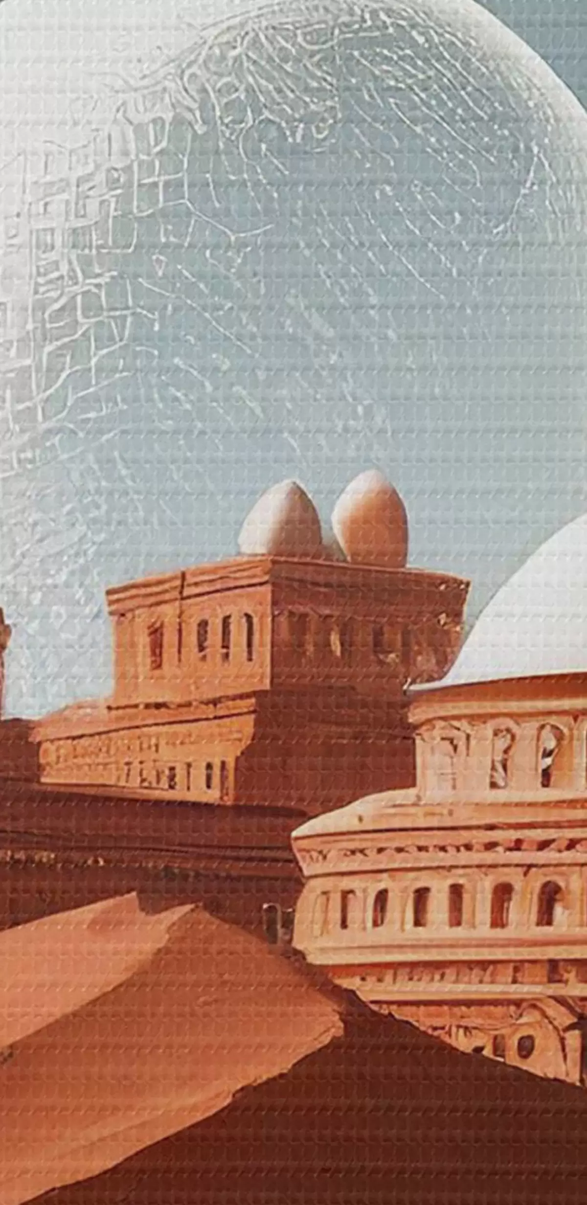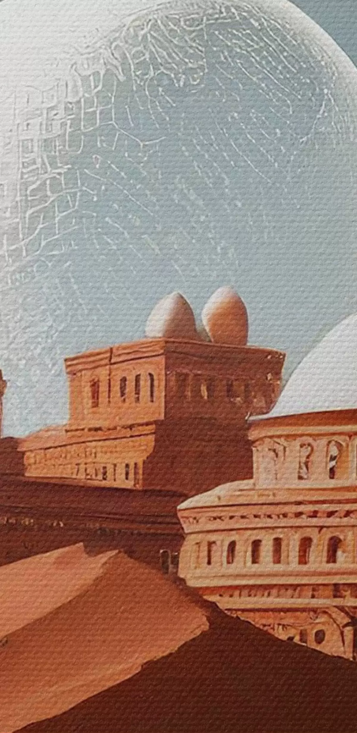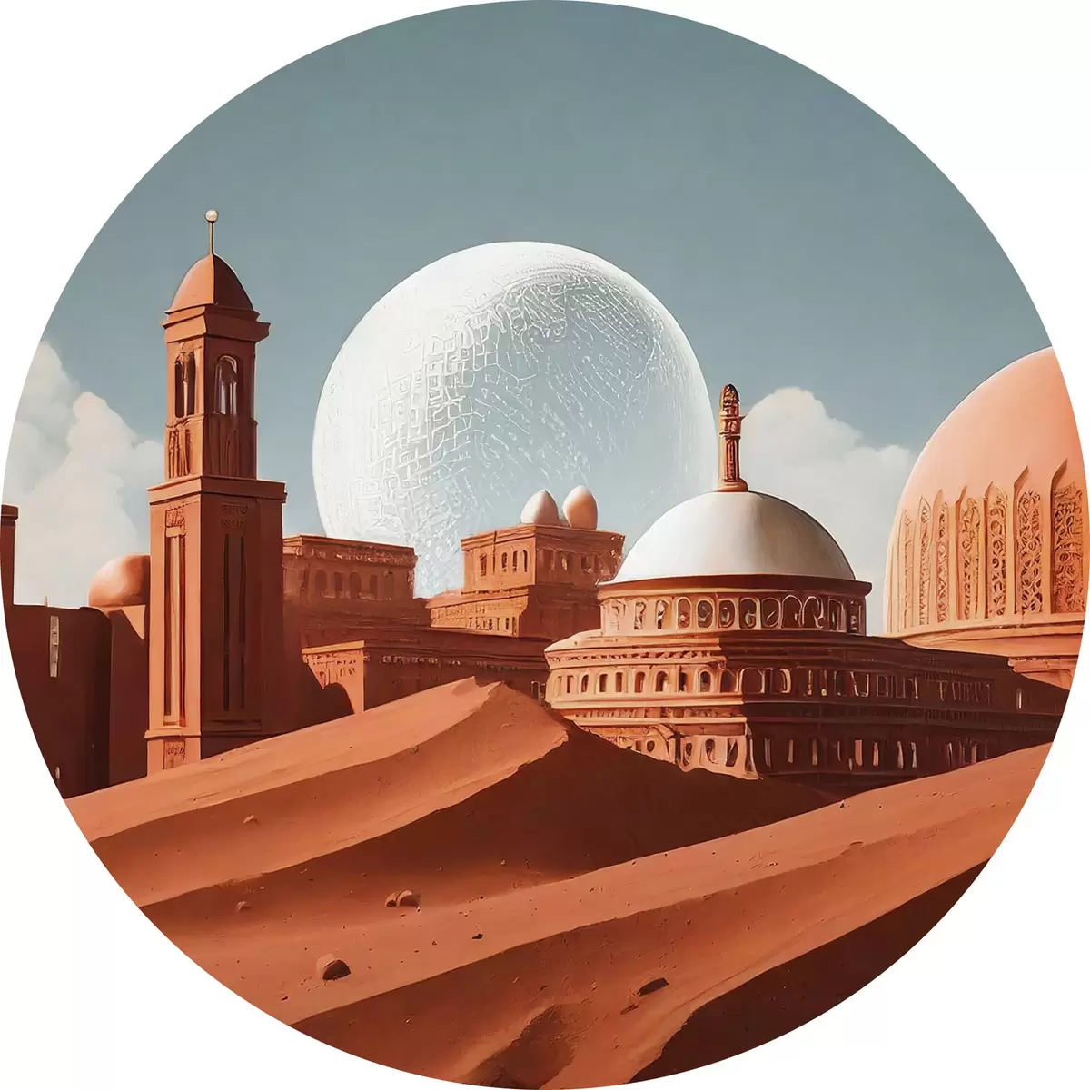 Pilt Kõrbemaastik koos hoonete ja suure valge palliga Nr r37814