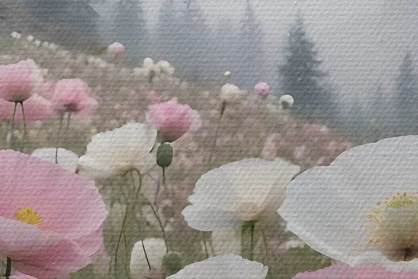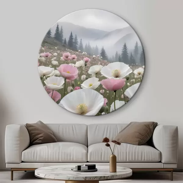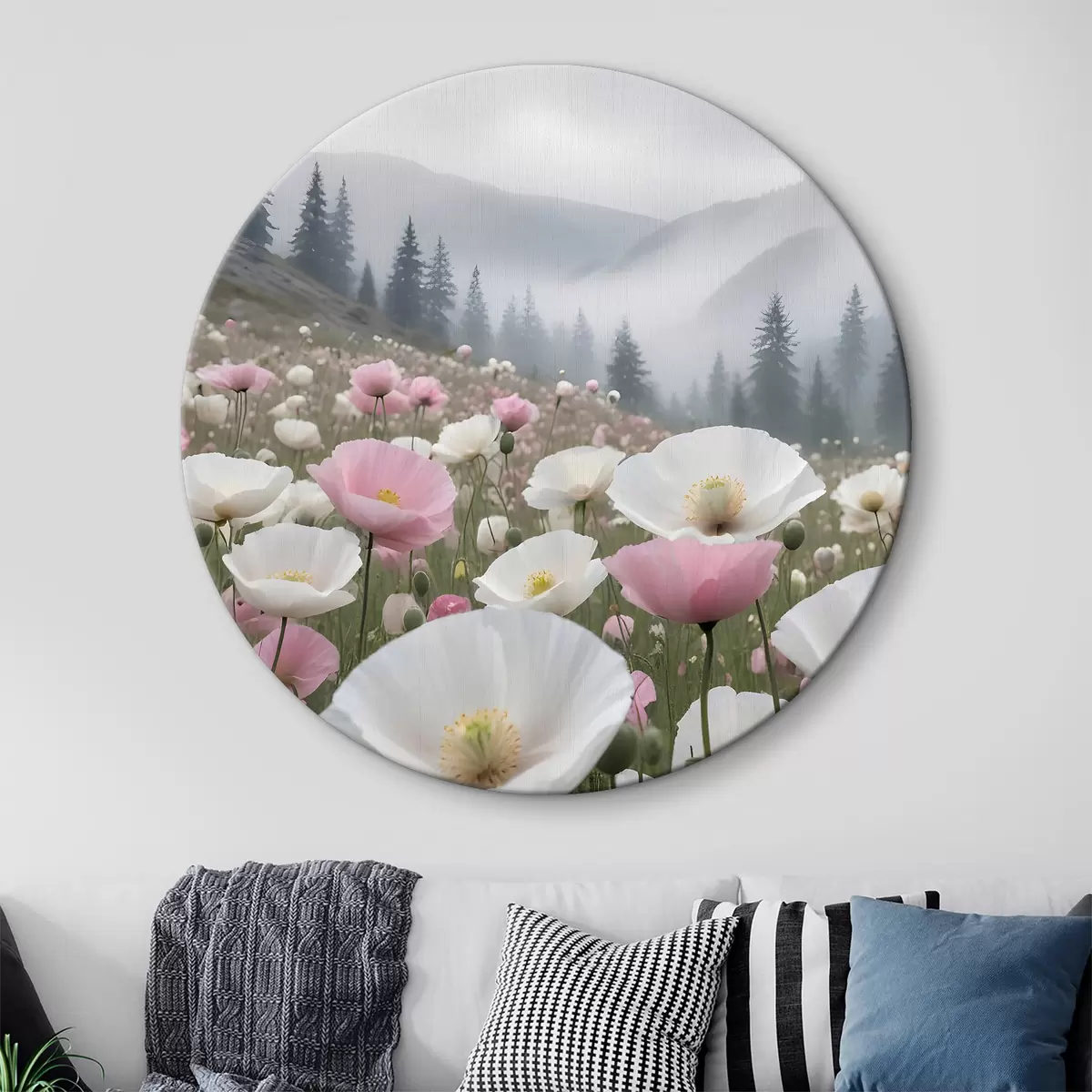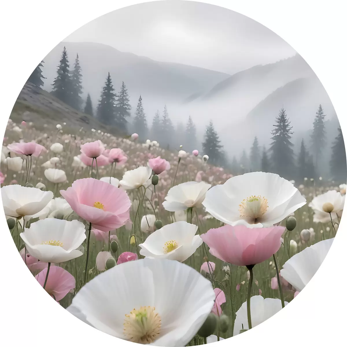 Pilt Taamal mägimaastikul roosade ja valgete moonide põld Nr r38369
