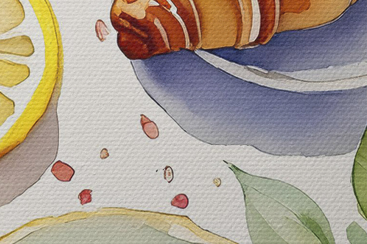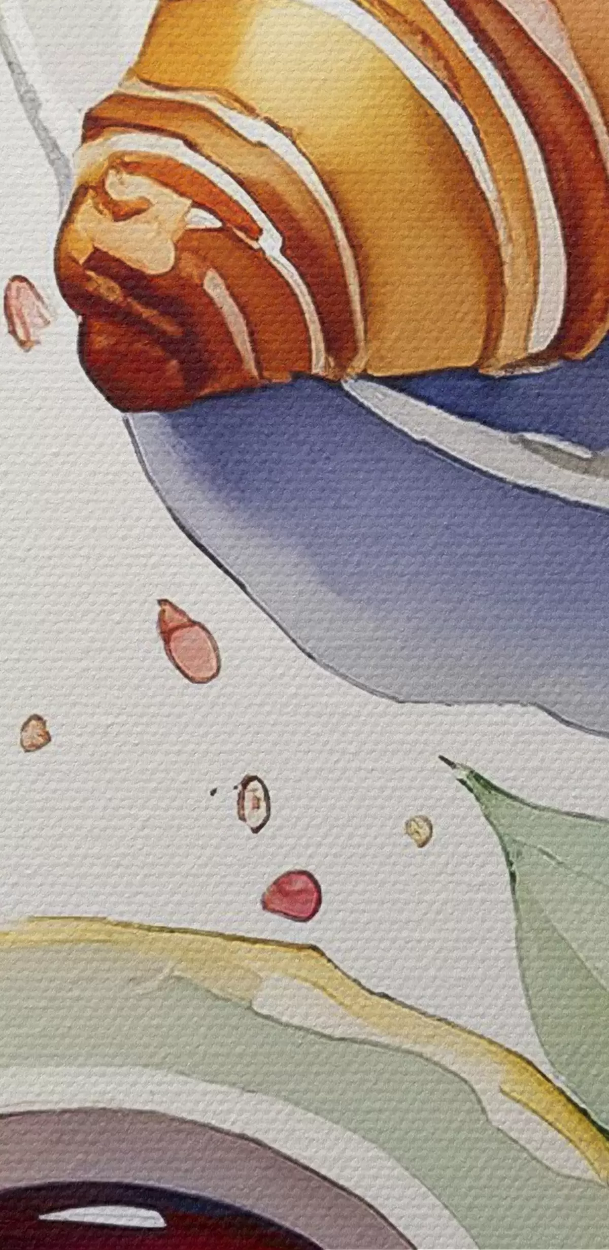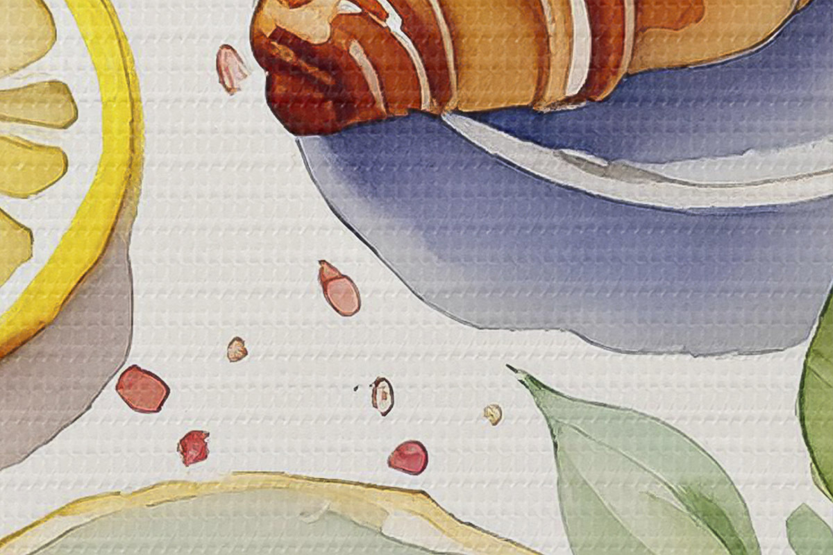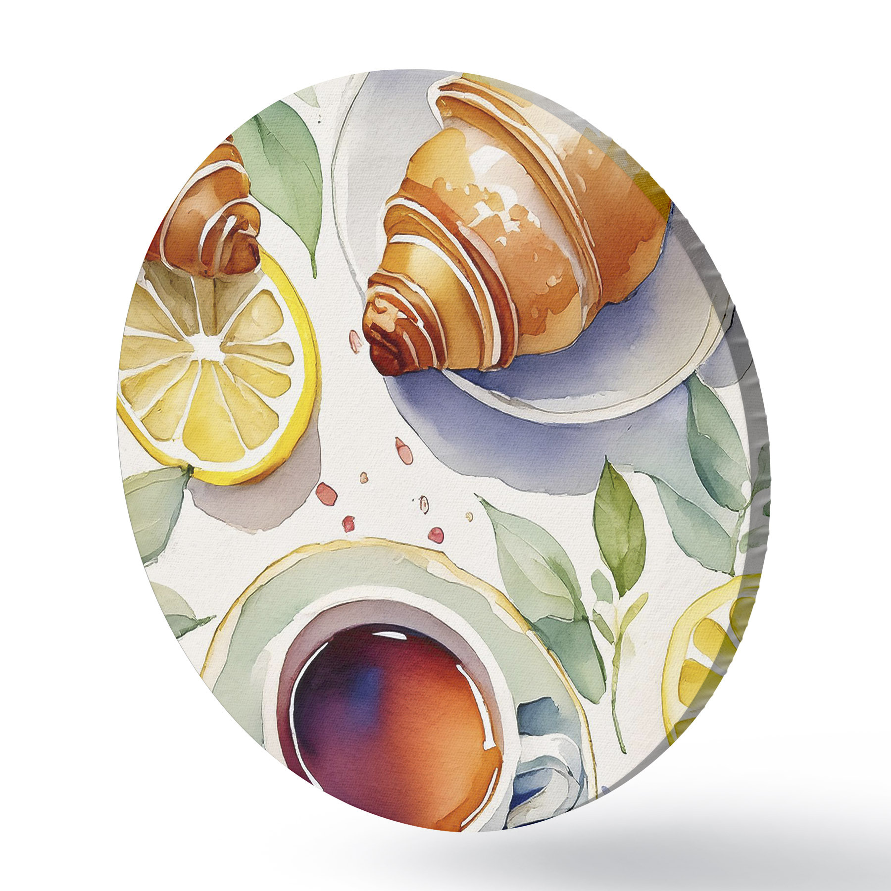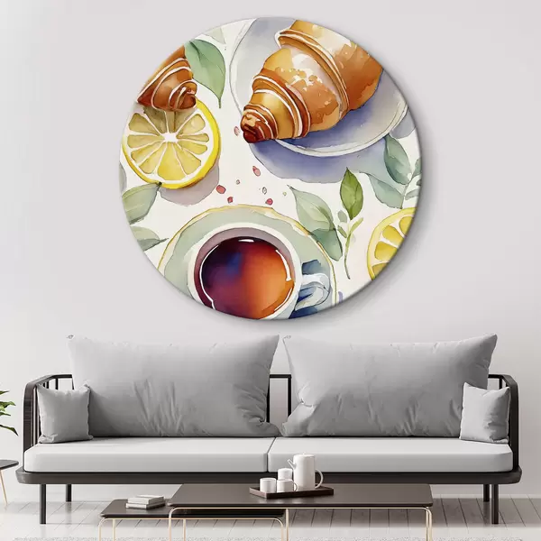 Pilt Croissant akvarell, tass teed, hommikusöök, sidrunid, maalähedane stiil Nr r38389