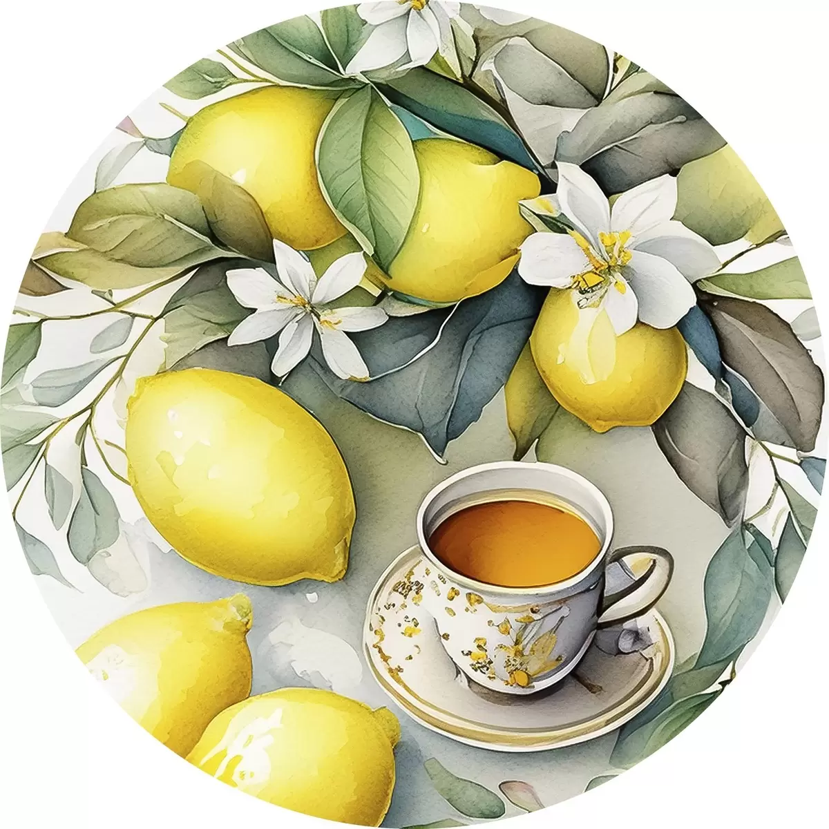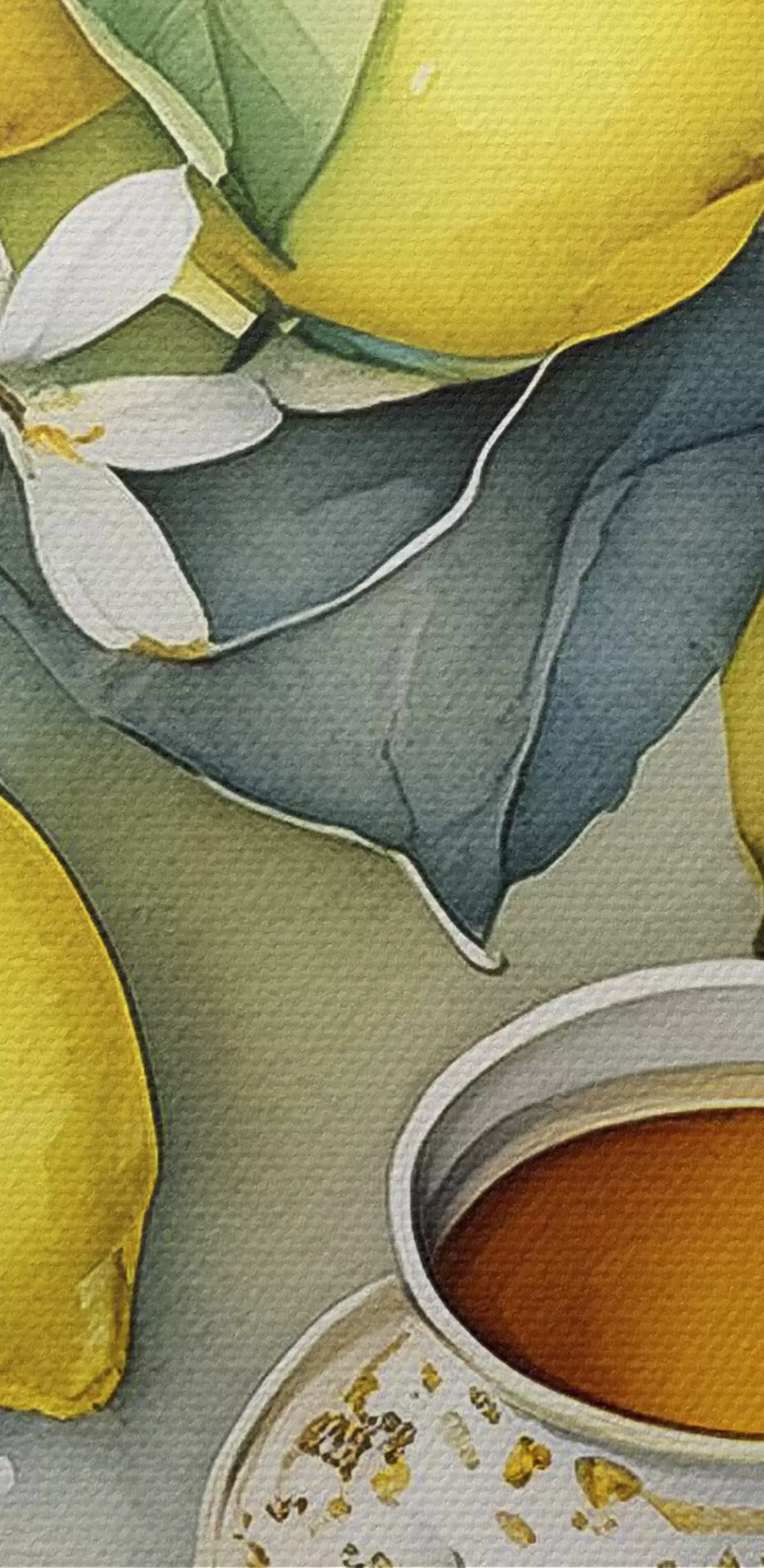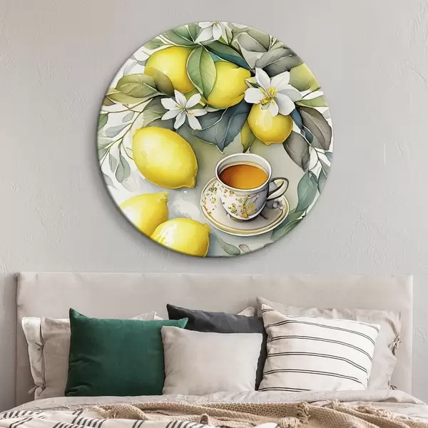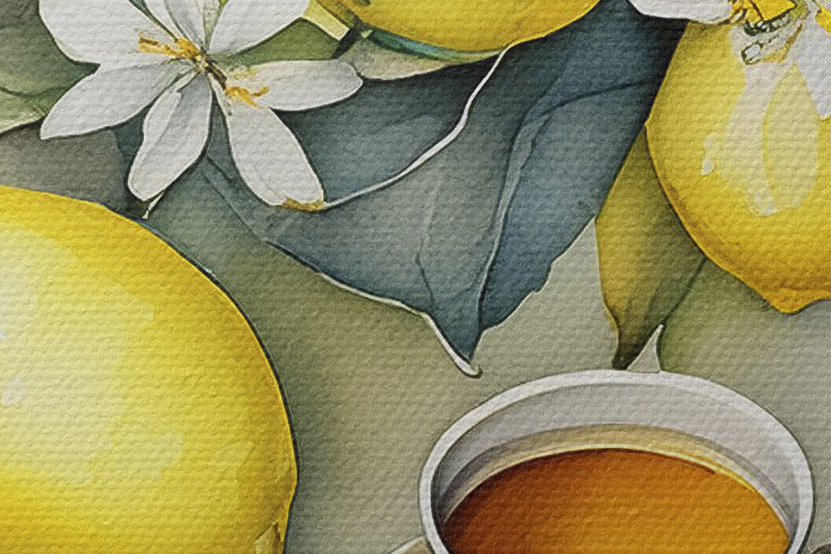Pilt Sidrunid ja lilled, akvarell, hommikusöök, tass teed, boheemlaslik stiil Nr r38403