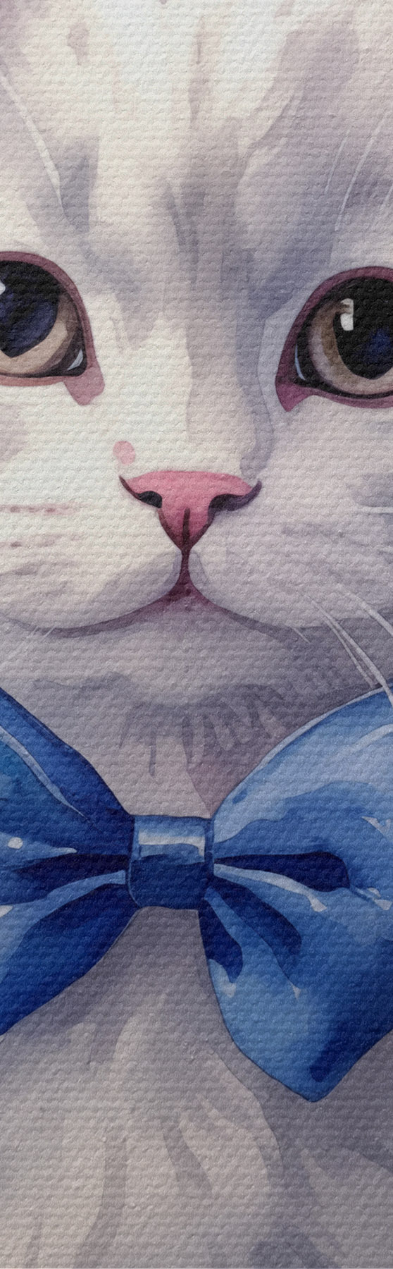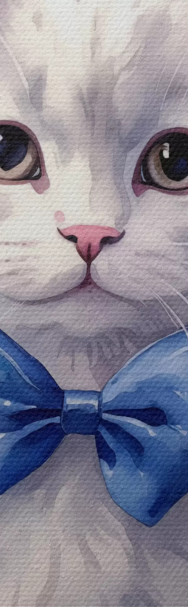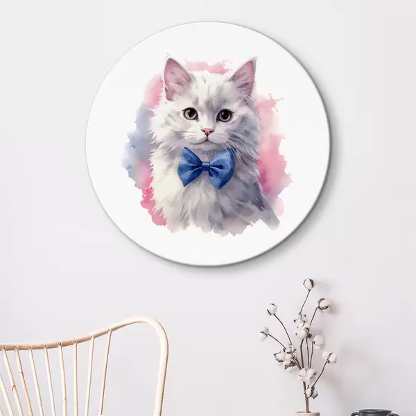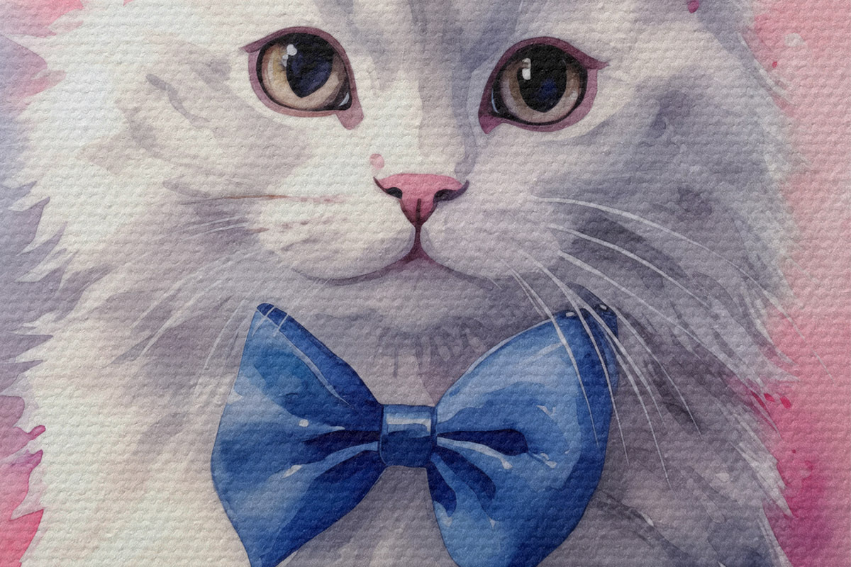 Pilt Valge kohev kass sinise vibuga kaelal, akvarell, loom, hall, valge, roosa, sinine Nr r38479