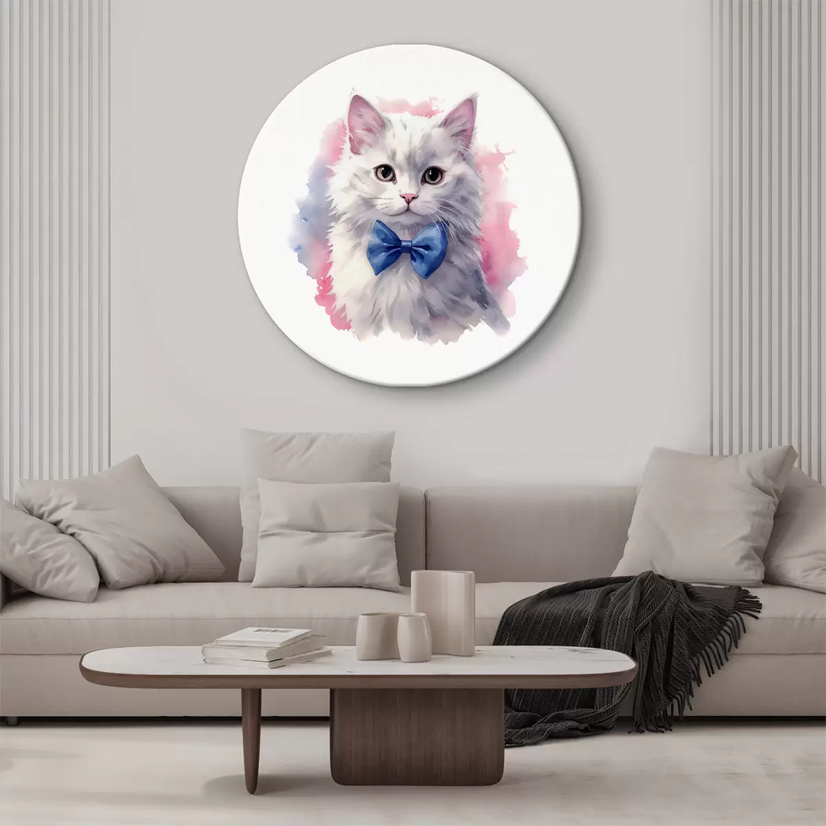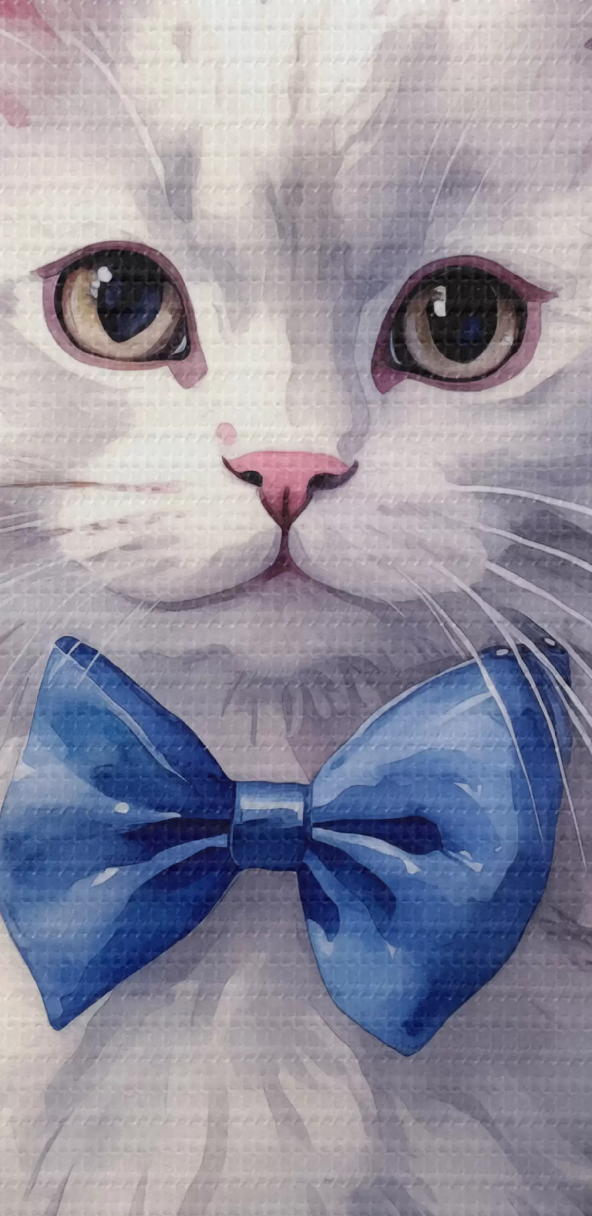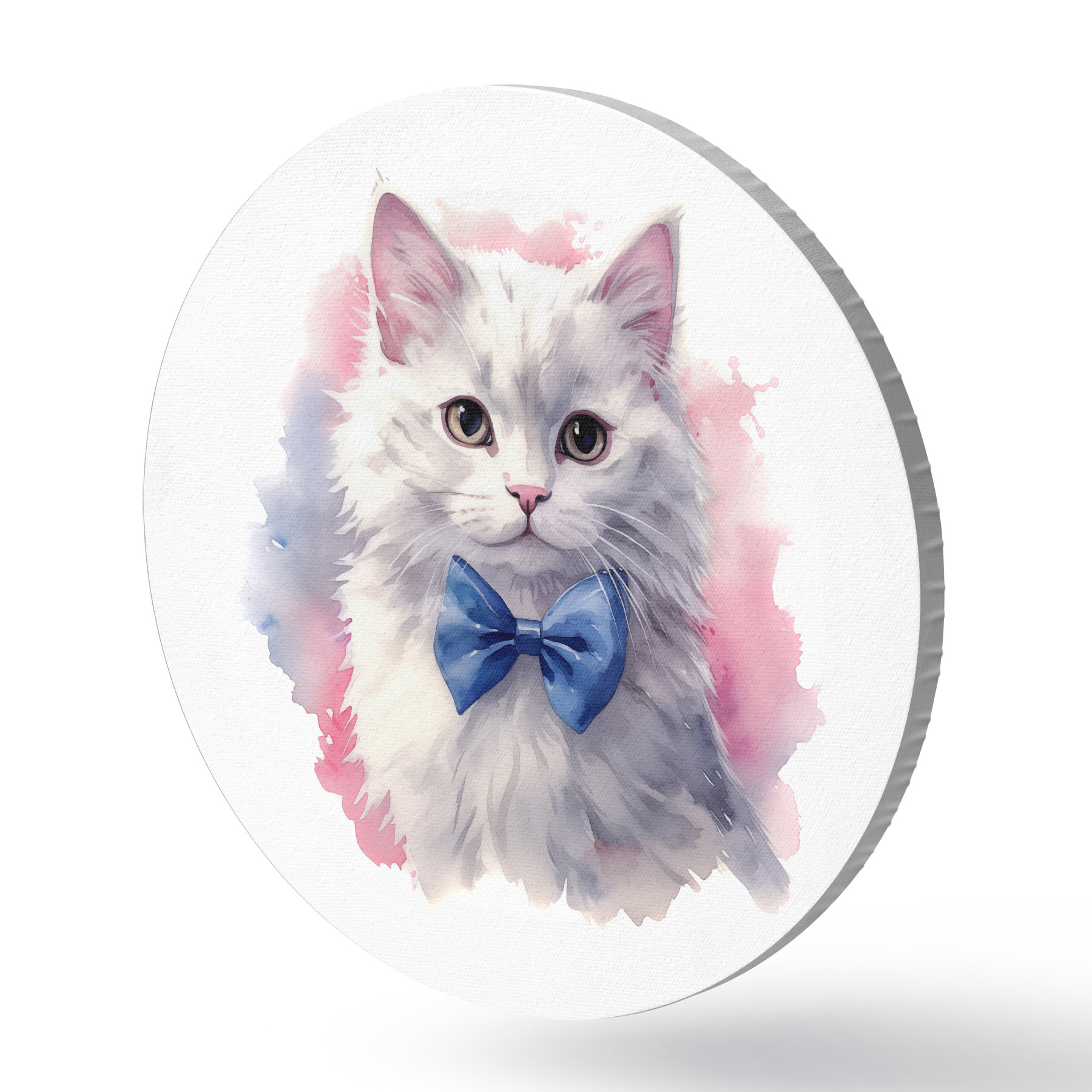 Pilt Valge kohev kass sinise vibuga kaelal, akvarell, loom, hall, valge, roosa, sinine Nr r38479