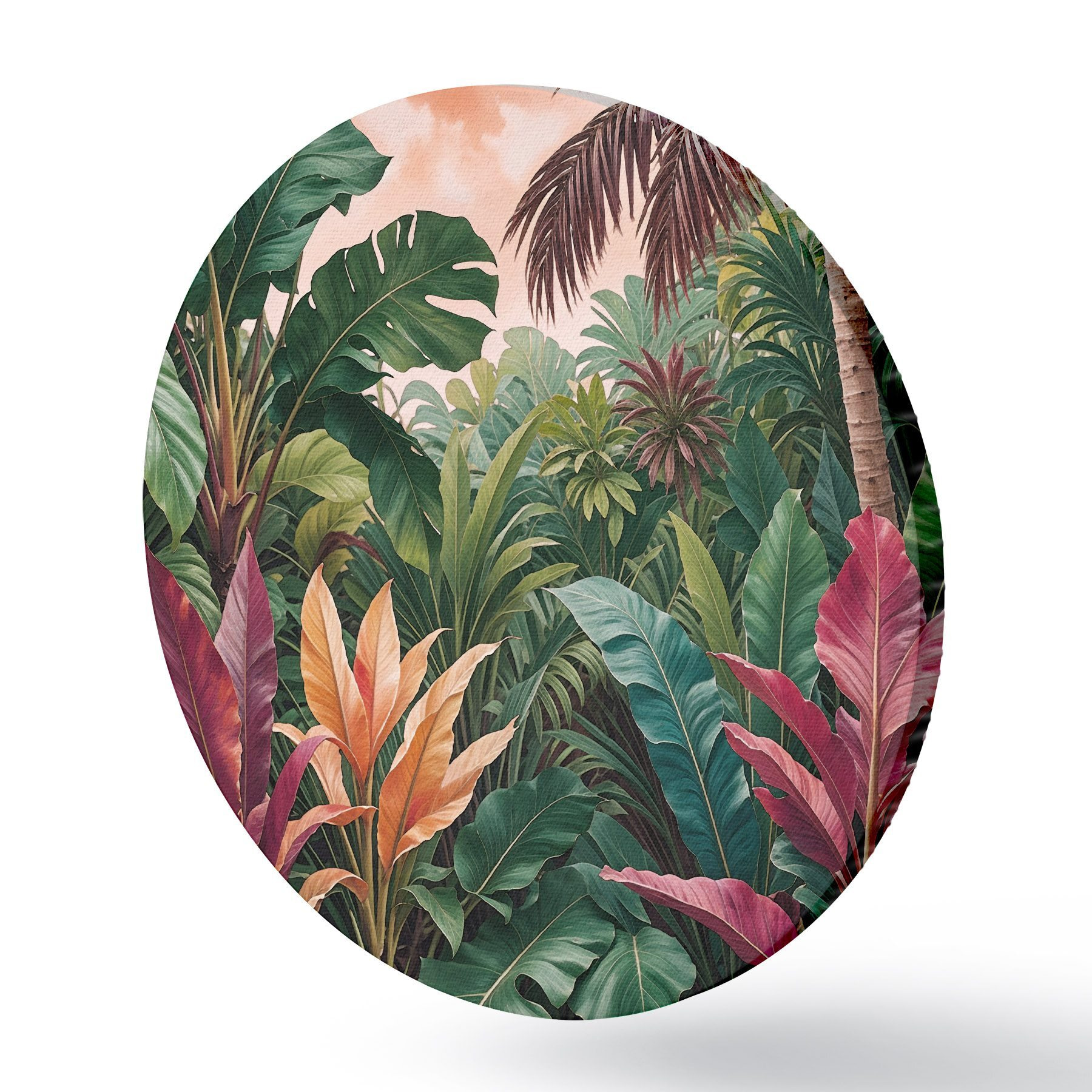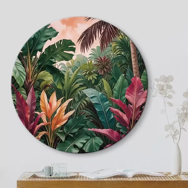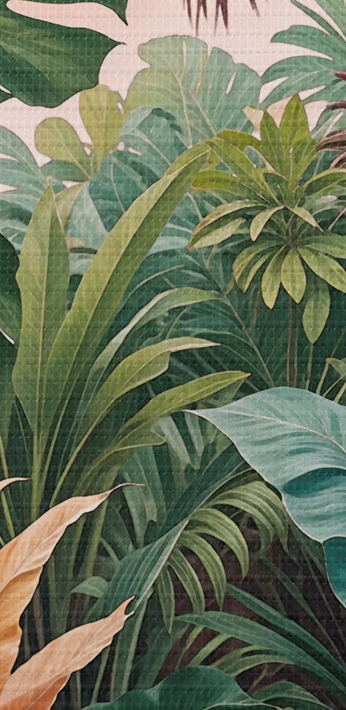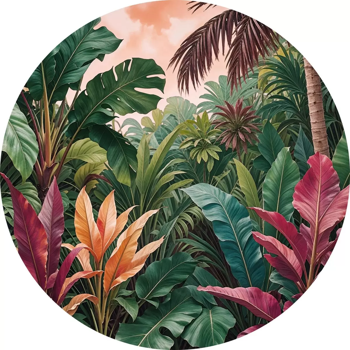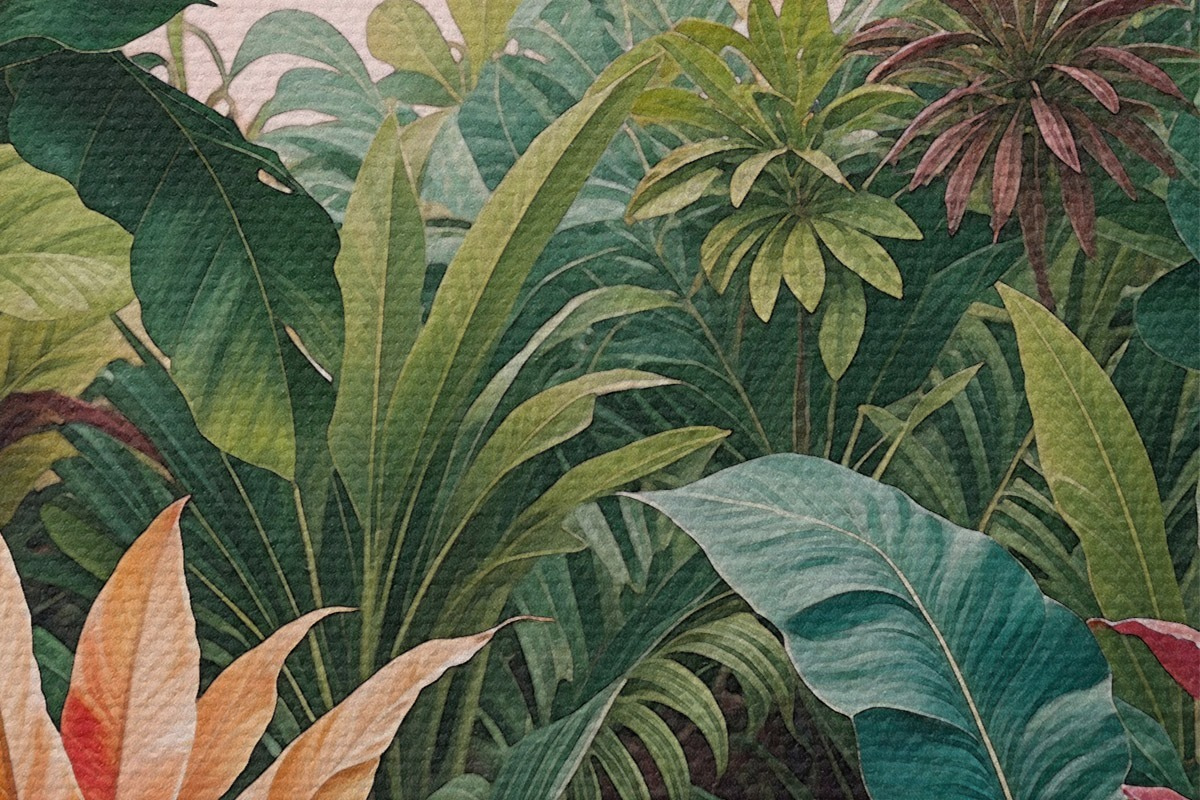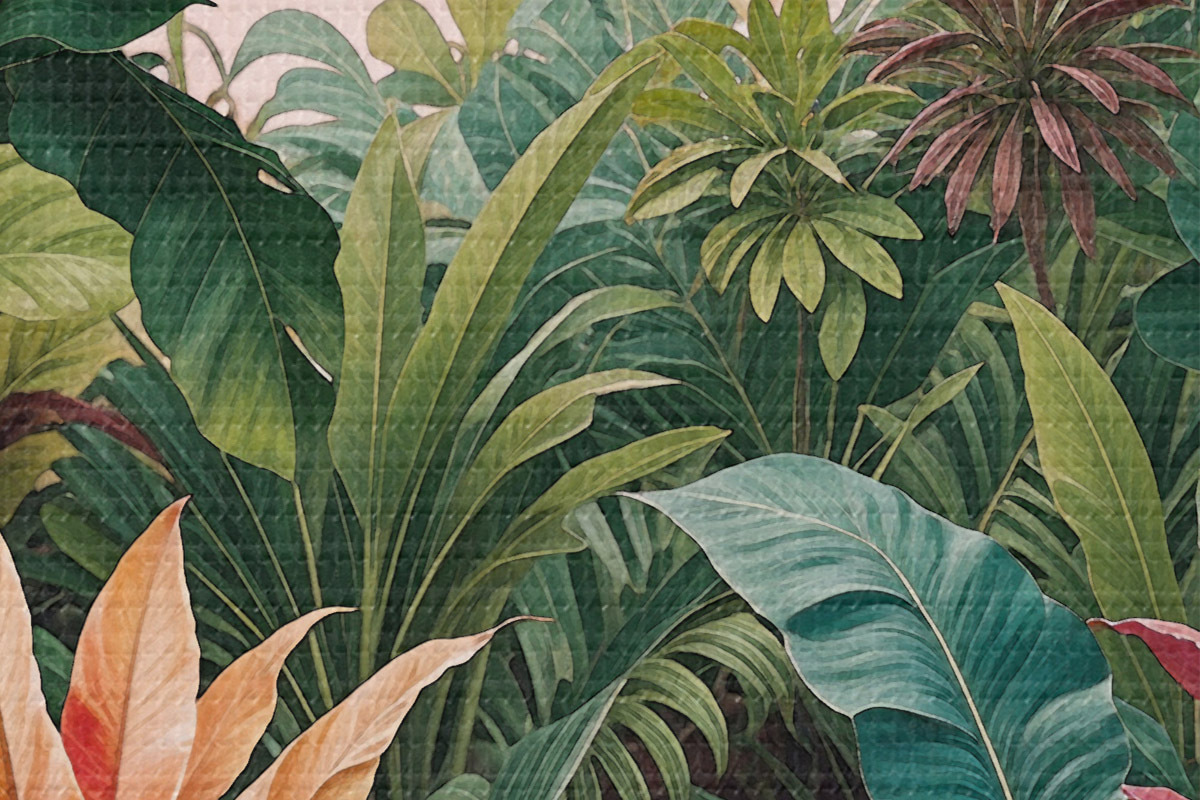 Pilt Lopsakas troopiline džungel elavate roheliste lehtede, palmilehtede ja värviliste lilledega Nr r38817