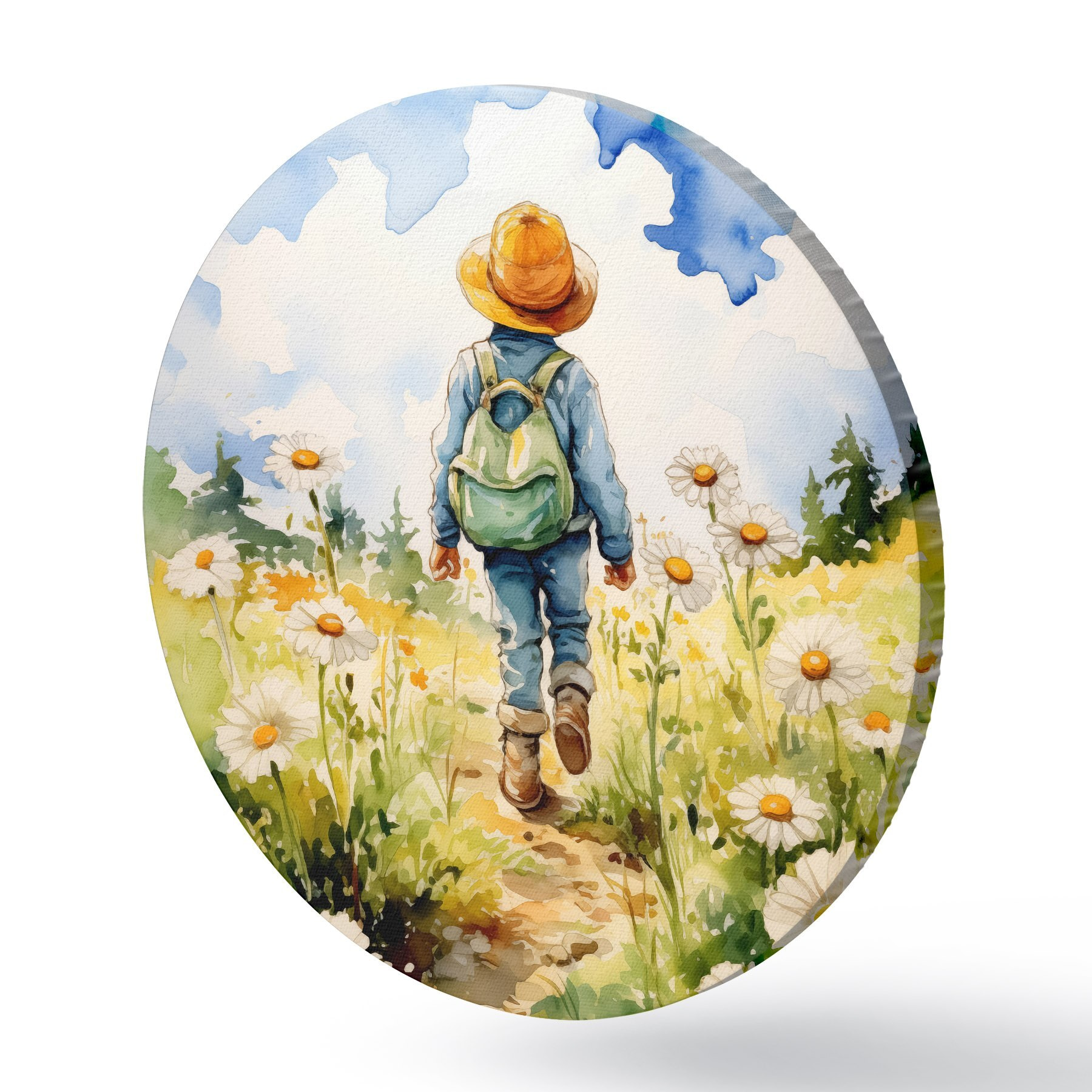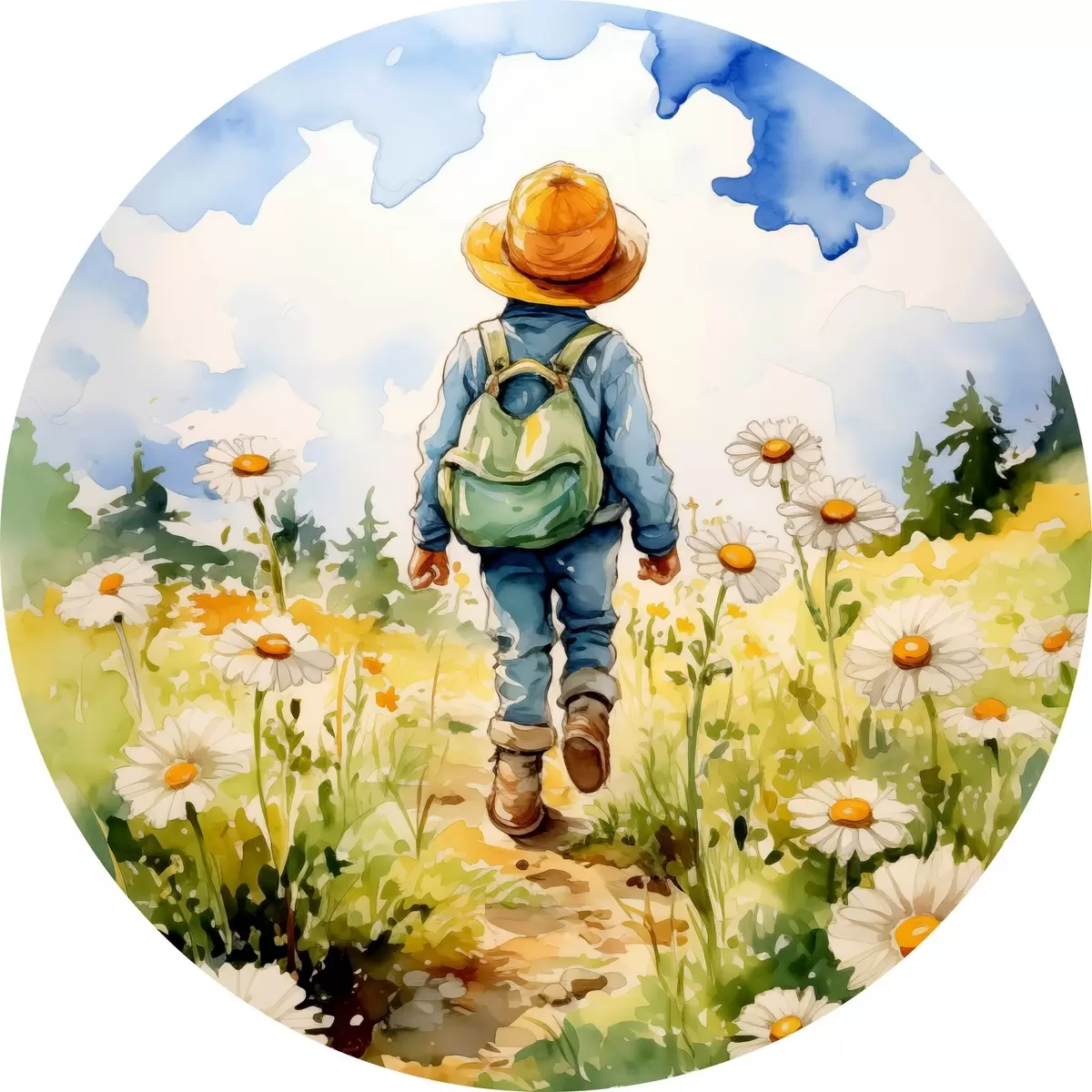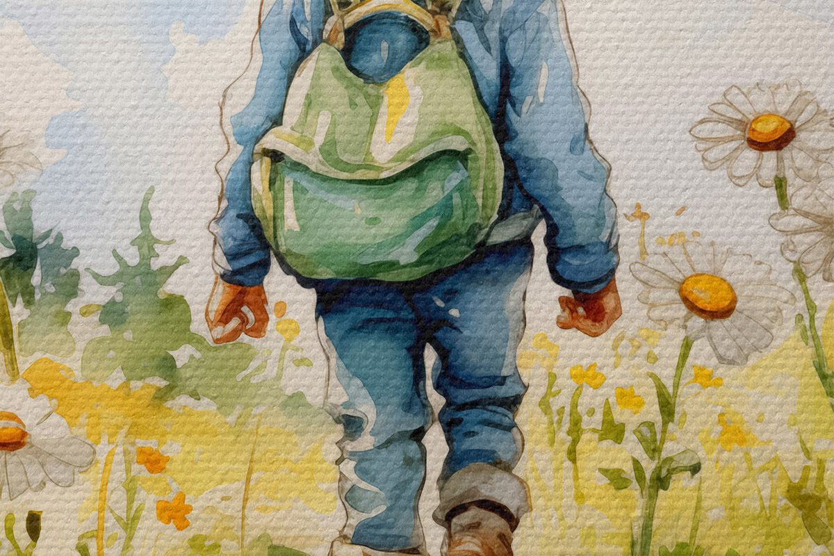 Pilt Kauboimütsis poiss, selja taga roheline seljakott ja sinine ülikond, kõnnib mööda teed kummeliväljal, akvarell Nr r38946