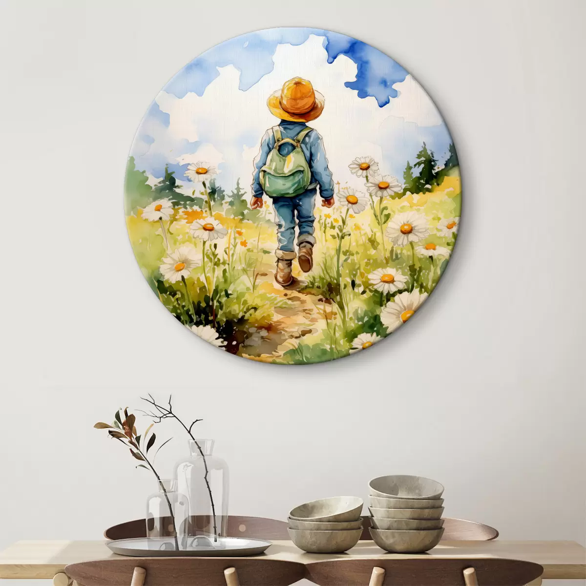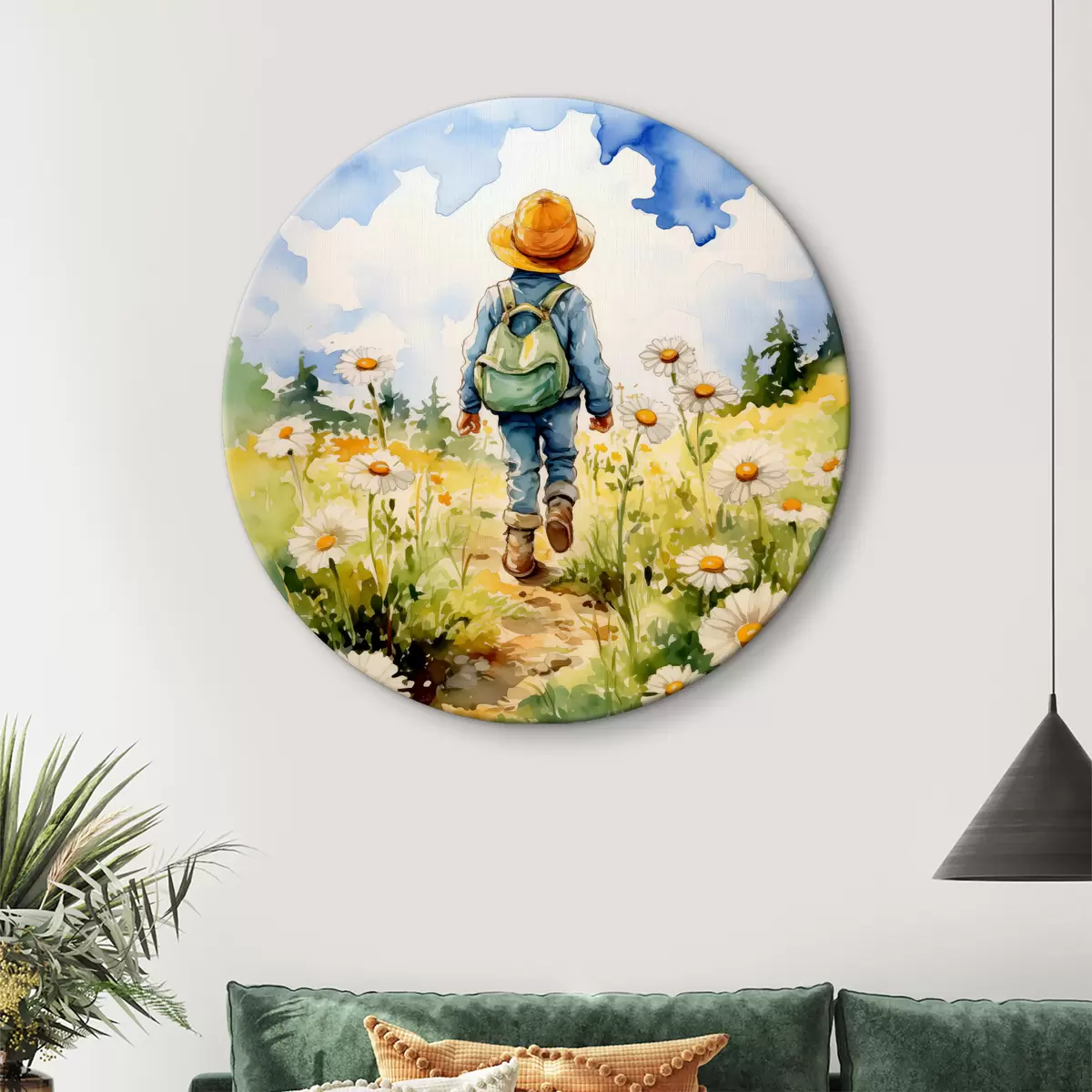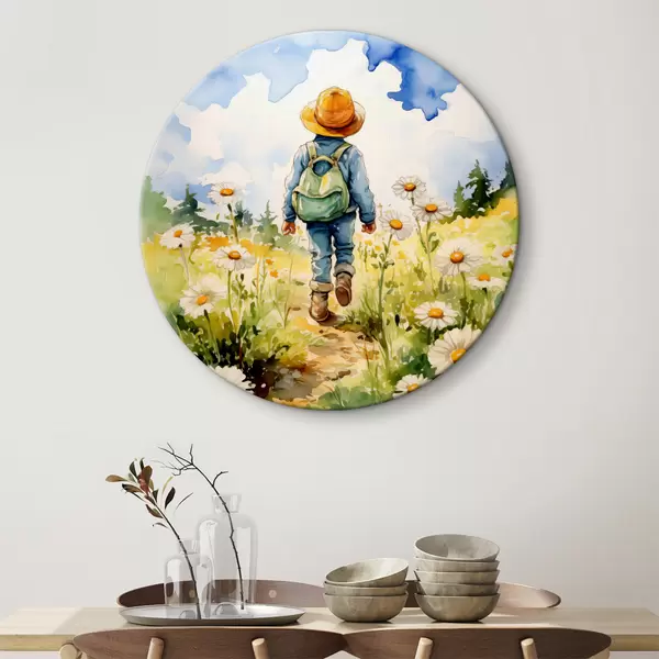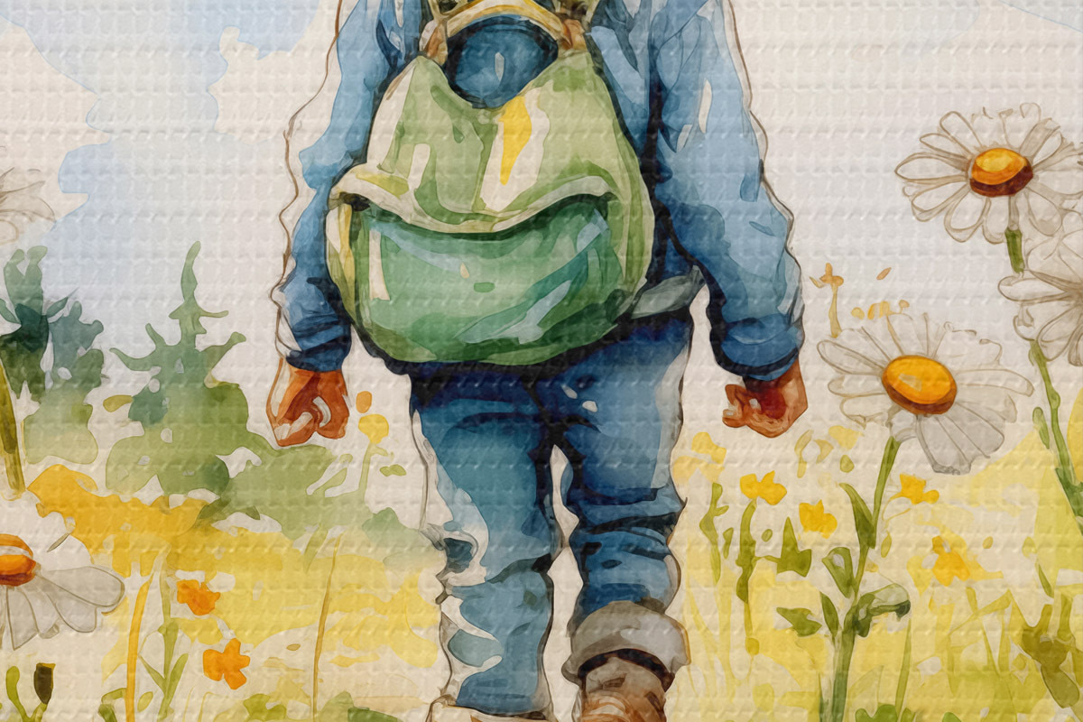 Pilt Kauboimütsis poiss, selja taga roheline seljakott ja sinine ülikond, kõnnib mööda teed kummeliväljal, akvarell Nr r38946