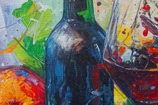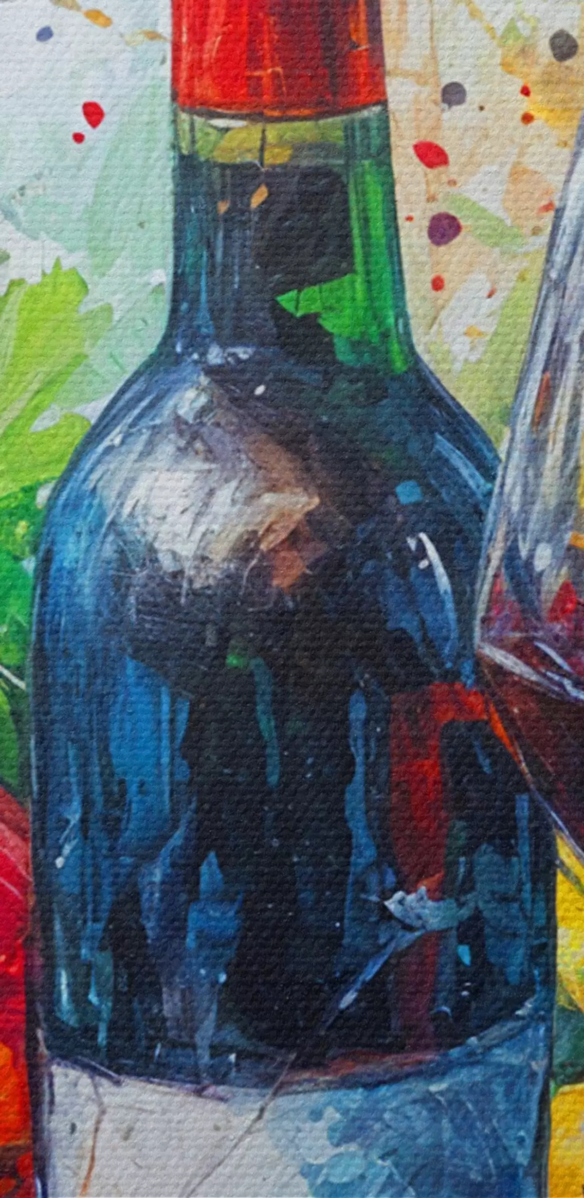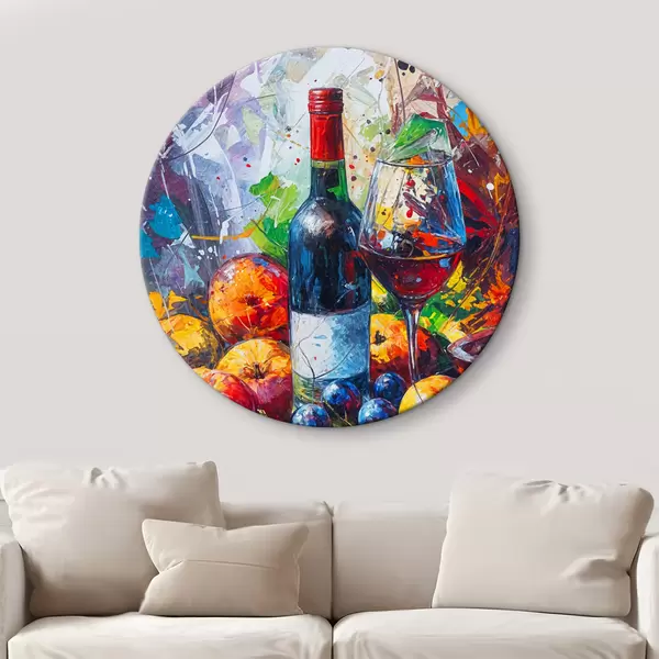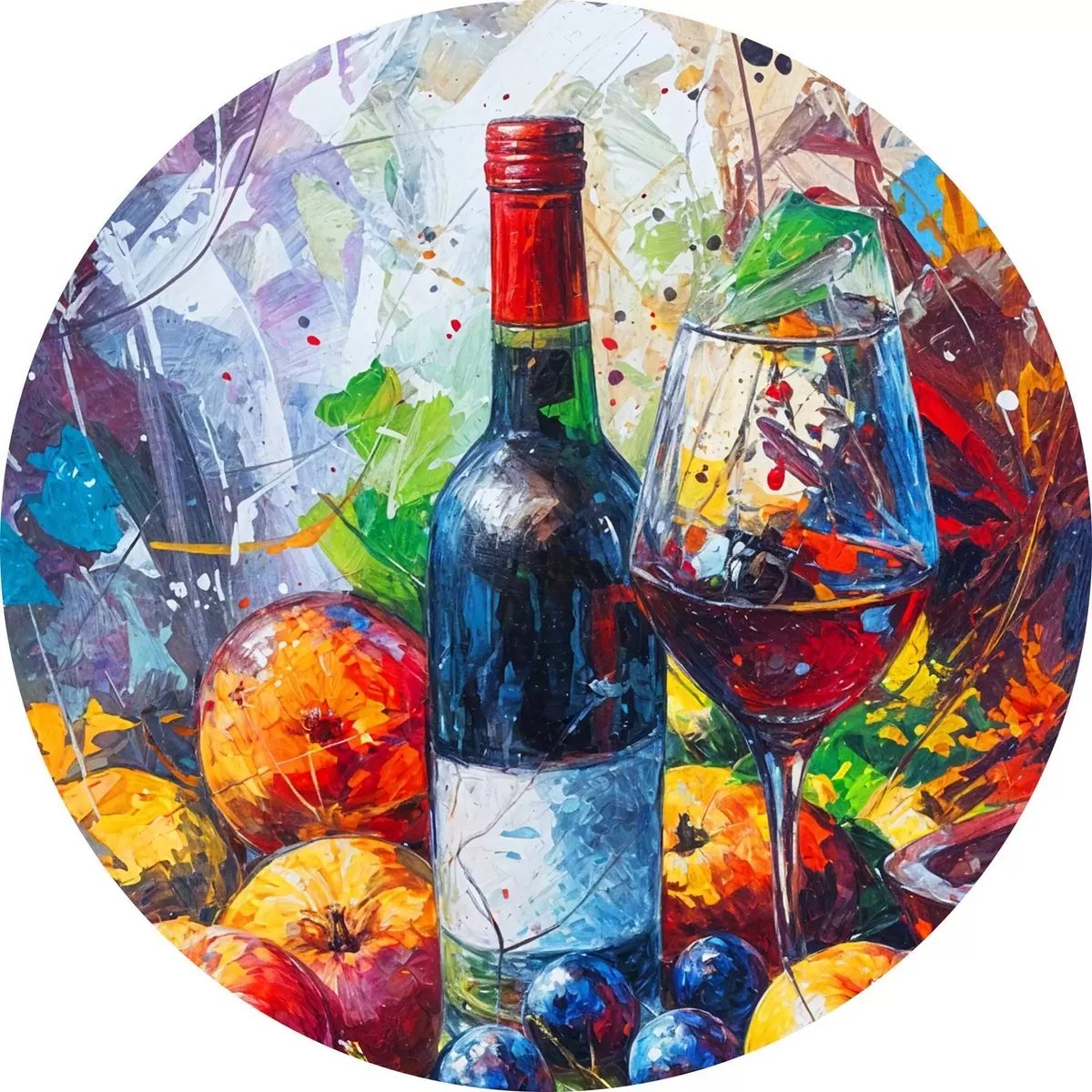 Pilt Abstraktne natüürmort veinipudelist, veiniklaasist ja värvilistest puuviljadest erinevat värvi pritsmetega Nr r38958